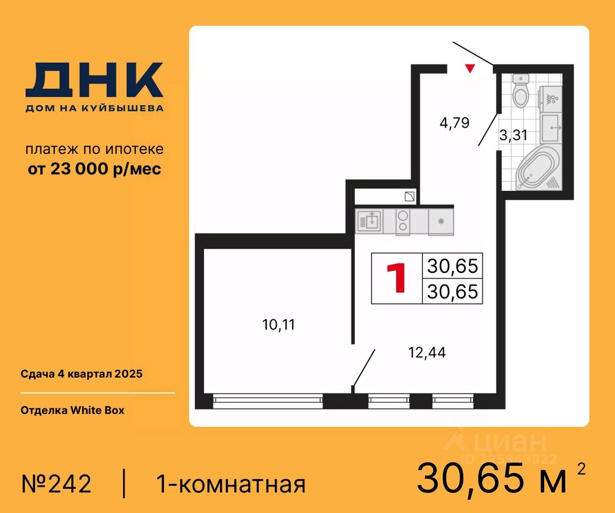 Просторная однокомнатная квартира с отделкой в ЖК "ДНК. Дом на Куйбышева" на 23 этаже. Общая площадь: 30.65 кв.м., жилая: 10.11 кв.м., площадь просторной кухни-столовой: 12.44 кв.м. Все окна выходят на одну сторону. В квартире один совмещенный санузел. Высота потолков 2.7 м.