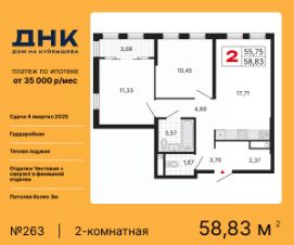 Спешите оформить бронирование по этой цене! Период предложения ограничен! Стоимость квартиры указана со скидкой, ваша экономия составит 500,000 RUB. По всем вопросам обращайтесь в офис продаж, наши менеджеры вам все расскажут! 2-комн. квартира с отделкой в ЖК "ДНК. Дом на Куйбышева" на 25 этаже. Общая площадь: 58.83 кв.м., жилая: 21.78 кв.м., площадь просторной кухни-столовой: 17.71 кв.м. Квартира угловая, идеально подойдет любителям тишины и панорамных видов. В квартире одна лоджия, один совмещенный и один раздельный санузел. Высота потолков 2.7 м. Квартира находится в корпусе 1. Дом монолитный, одноподъездный, высотой 25 этажей. На этаже 9 квартир. В подъезде 2 пассажирских и 1 грузовой лифт. Окончание строительства - 4 квартал 2025 года. Оформление сделки по договору долевого участия. Дом на Куйбышева — это новый проект комфорт-класса, который представляет собой не просто квадратные метры, а настоящую точку сосредоточения качества, эстетики и функциональности. Мы, команда BAZA Development, стремимся выбирать только лучшее для жизни, и это заложено в нашем ДНК. Проект "Дом на Куйбышева" является частью квартальной застройки, осуществляемой в сотрудничестве с компанией Астон. BAZA отвечает за строительство двух домов, один из которых будет 25-этажным, с качественной и функциональной застройкой, а также умным благоустройством. Приватный двор с видеонаблюдением скрыт между домами и закрыт для автомобилей и случайных прохожих. Здесь приятно проводить время в любое время года: летом можно укрыться в тени деревьев, осенью наслаждаться яркими красками, зимой гулять вдоль заснеженных яблонь, а весной встречать пробуждение природы. Сквозной холл с мягким лобби служит нейтральной территорией для экспресс-встреч и зоной ожидания для курьеров. В холлах предусмотрены гостевые санузлы, а также зоны с доступом только для жителей: колясочная и место для хранения малогабаритного снаряжения. Комьюнити-центр — это уникальная особенность домов BAZA, бесплатное общее пространство для жителей. Это не просто белая коробка с проектором, а продуманное уютное помещение с дизайном, зонированием и мебелью. Здесь можно поработать, пообщаться, устроить вечеринку или провести обучение. На первом этаже предусмотрена колясочная для хранения малогабаритного транспорта и снаряжения, доступная только для жителей. В гостевых санузлах также находятся лапомойки для четвероногих друзей и жителей дома. Команда УК BAZA — одно из подразделений застройщика. Офис УК находится прямо в доме. Каждый месяц УК измеряет индекс лояльности с помощью telegram-бота, в прямом эфире проводятся online-собрания, а для жителей есть удобное приложение, чтобы оплатить коммунальный услуги и оставить обращение. Также УК организует праздники, мероприятия и мастер-классы для жителей. #zSbFDO