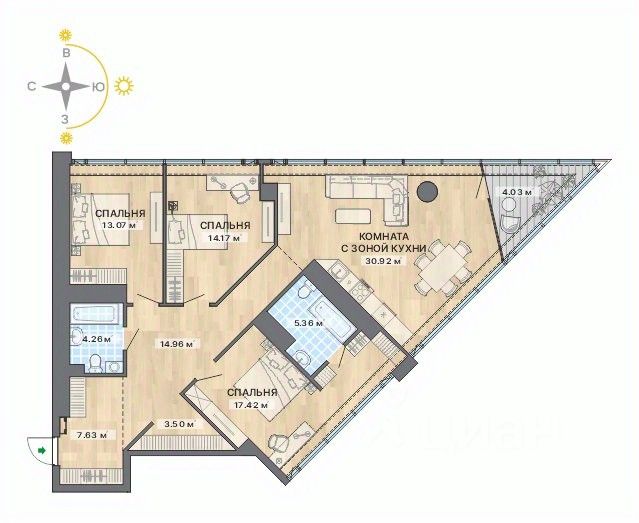 На выбор покупателей — апартаменты площадью от 48,5 до 131 м², в том числе свободной планировки. Из окон открываются панорамные виды на Екатеринбург-Сити и набережную Городского пруда.