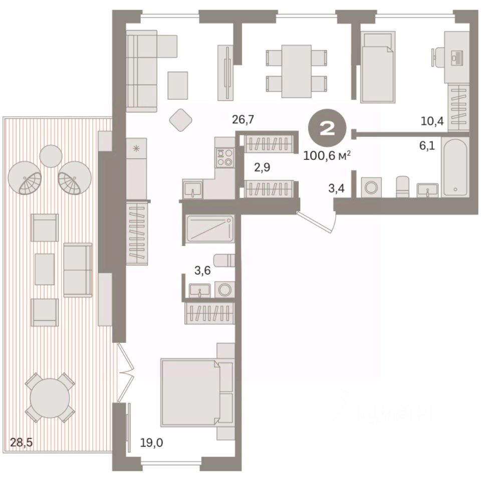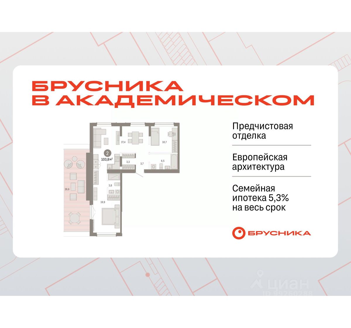 Квартира с кухней-гостиной и двумя спальнями в Бруснике в Академическом. Особенности планировки: гардеробная, вид во двор, разнесённые спальни, предчистовая отделка, мастер-спальня, терраса на крыше.