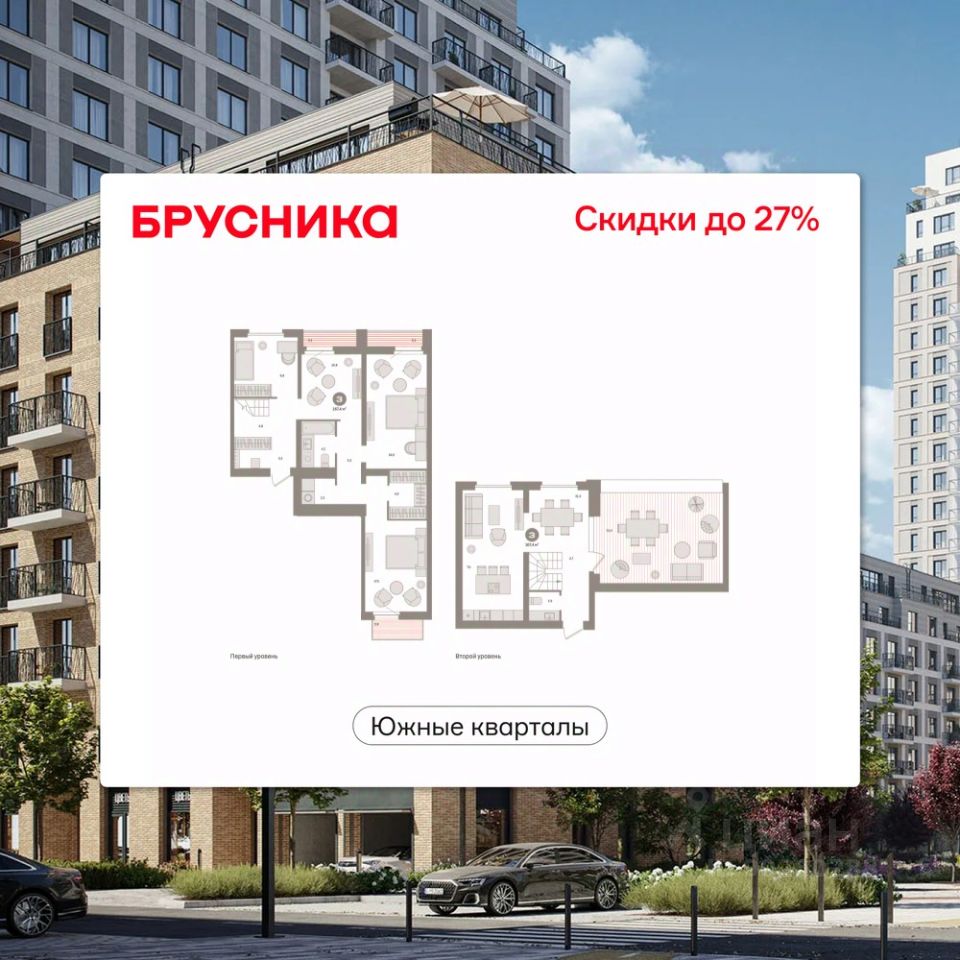 Квартира с кухней-гостиной и четырьмя спальнями в Южных кварталах. Особенности планировки: балкон, вид во двор, второй санузел, гардеробная, летняя кухня на крыше, лоджия, окна на две стороны, постирочная, предчистовая отделка, рабочий кабинет, разнесённые спальни, терраса на крыше.