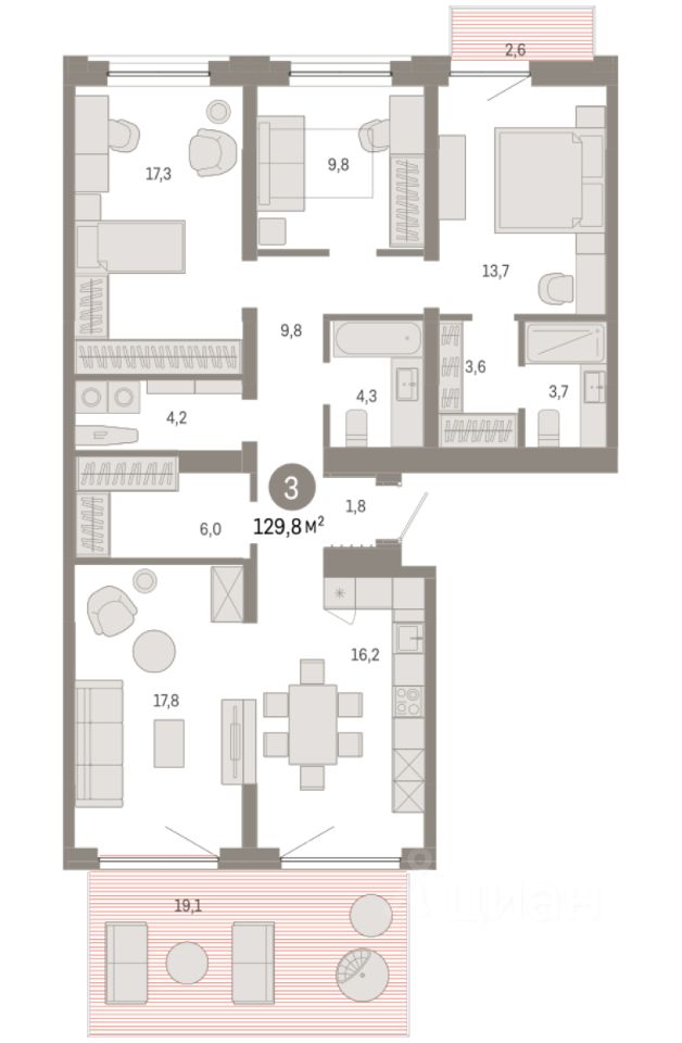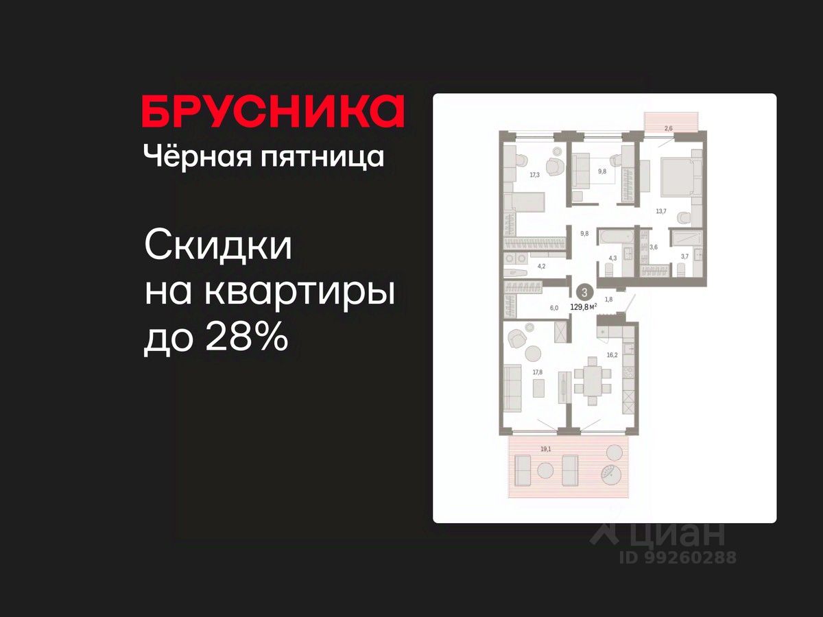 Квартира с кухней-гостиной и тремя спальнями в Южных кварталах. Особенности планировки: окна на две стороны, гардеробная, рабочий кабинет, вид во двор, разнесённые спальни, предчистовая отделка, мастер-спальня, терраса, постирочная, балкон.