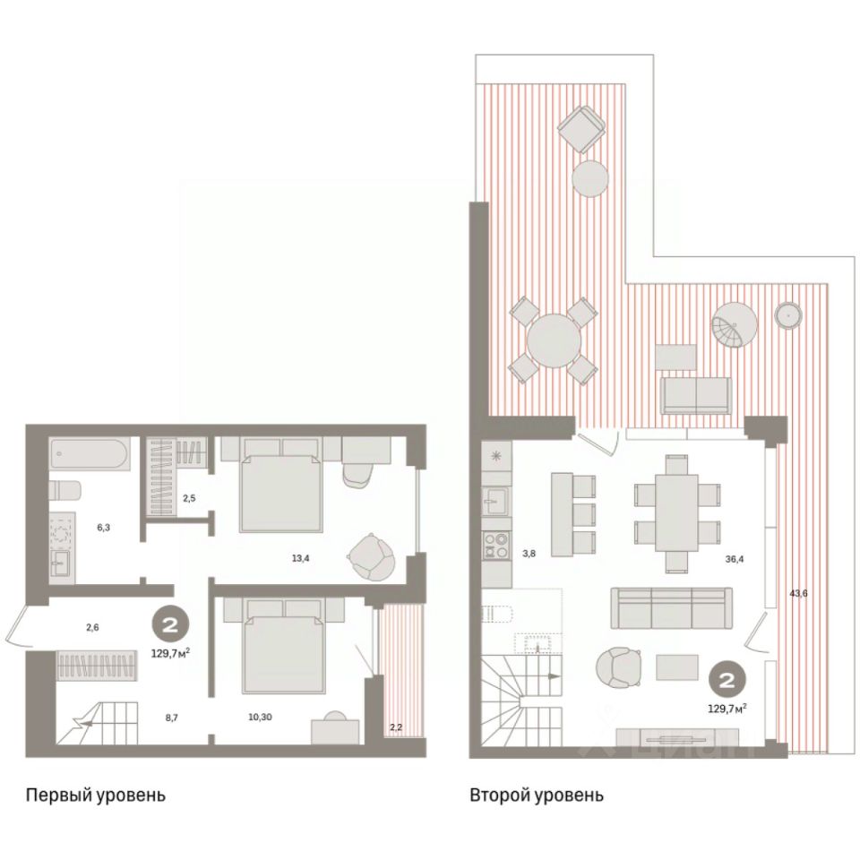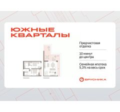 Квартира с кухней-гостиной и двумя спальнями в Южных кварталах. Особенности планировки: гардеробная, окна в пол, лоджия, предчистовая отделка, терраса на крыше.