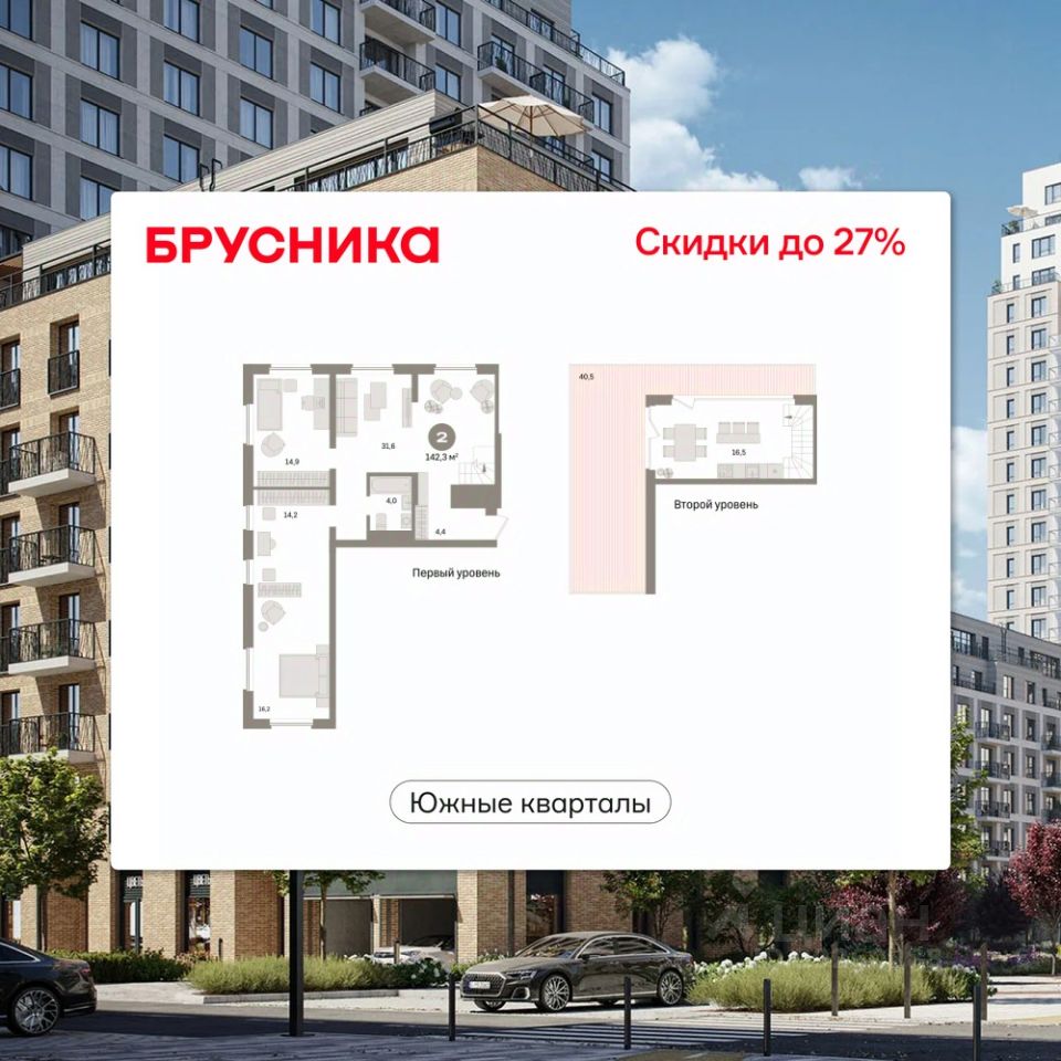 Двухуровневая квартира с кухней-гостиной и двумя спальнями в Южных кварталах. Особенности планировки: вид во двор, гардеробная, двухуровневая, окна в пол, окно в коридоре, предчистовая отделка, разнесённые спальни, терраса на крыше.