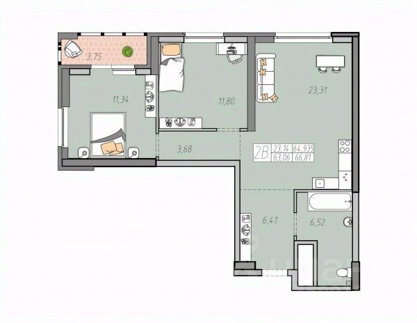 Продаётся 2-комнатная квартира в сданном доме (Печатников, 5 (Дом 1)), срок сдачи: IV-кв. 2024, общей площадью 64.935 кв.м., на 25 этаже.