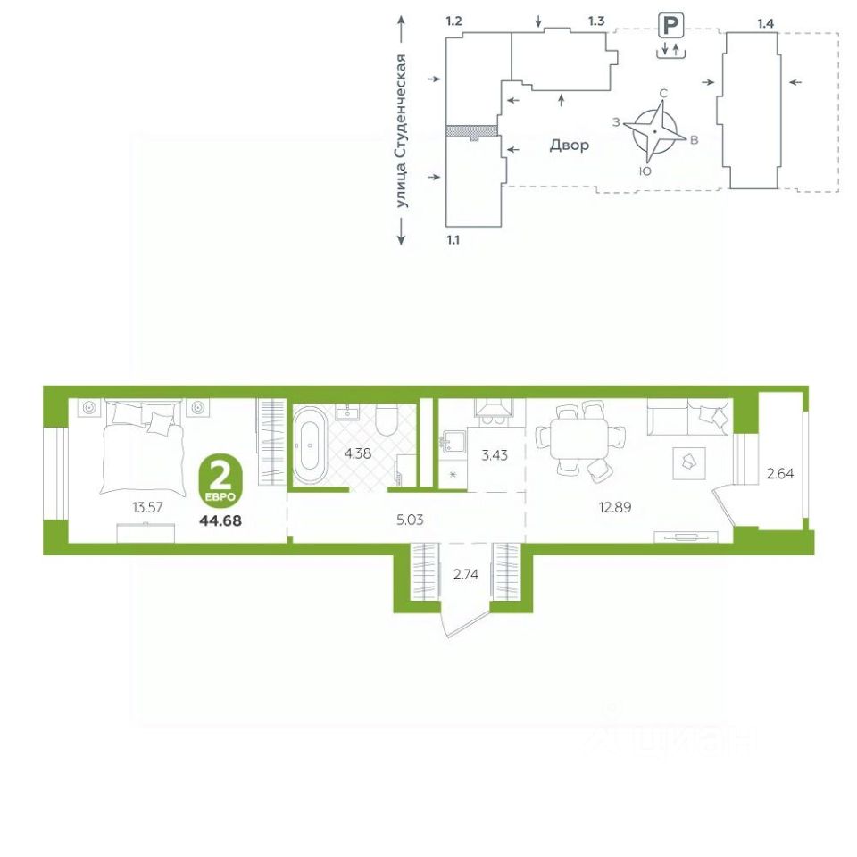 Предусмотрен подземный паркинг и кладовые. Срок сдачи 3 квартал 2026 г.