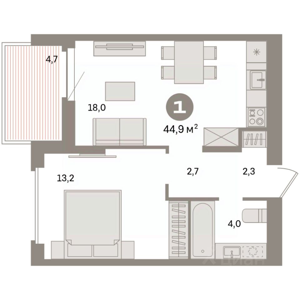 Квартира с кухней-гостиной и одной спальней в квартале "Депо". Особенности планировки: предчистовая отделка, балкон.