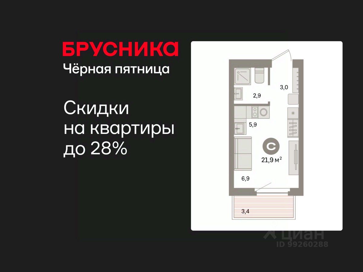 Студия в квартале "Депо". Особенности планировки: предчистовая отделка, балкон.