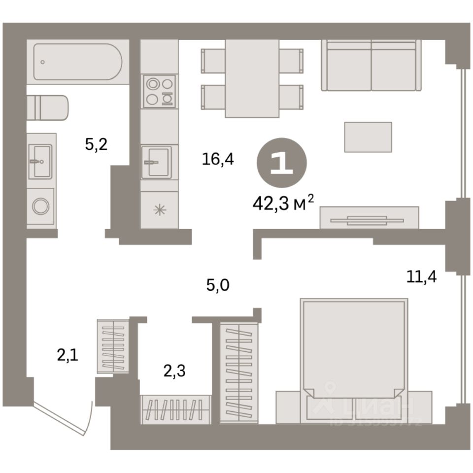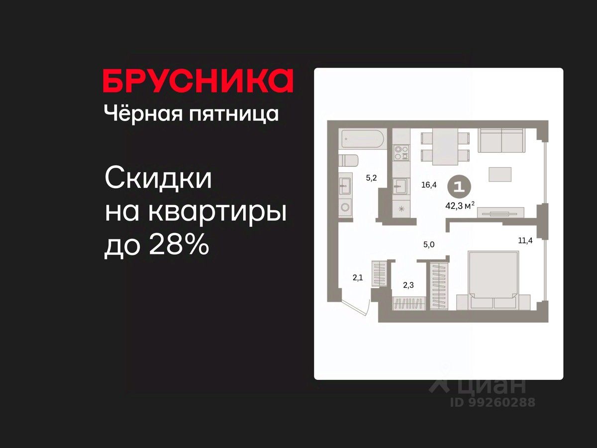 Квартира с кухней-гостиной и одной спальней в квартале "Депо". Особенности планировки: гардеробная, вид во двор, предчистовая отделка.