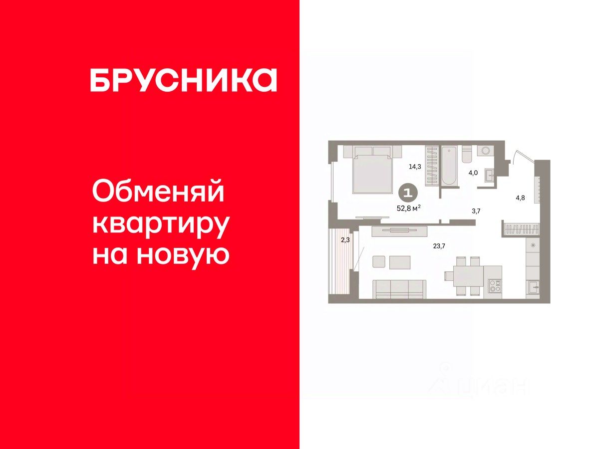 Квартира с кухней-гостиной и одной спальней в квартале "Депо". Особенности планировки: предчистовая отделка.