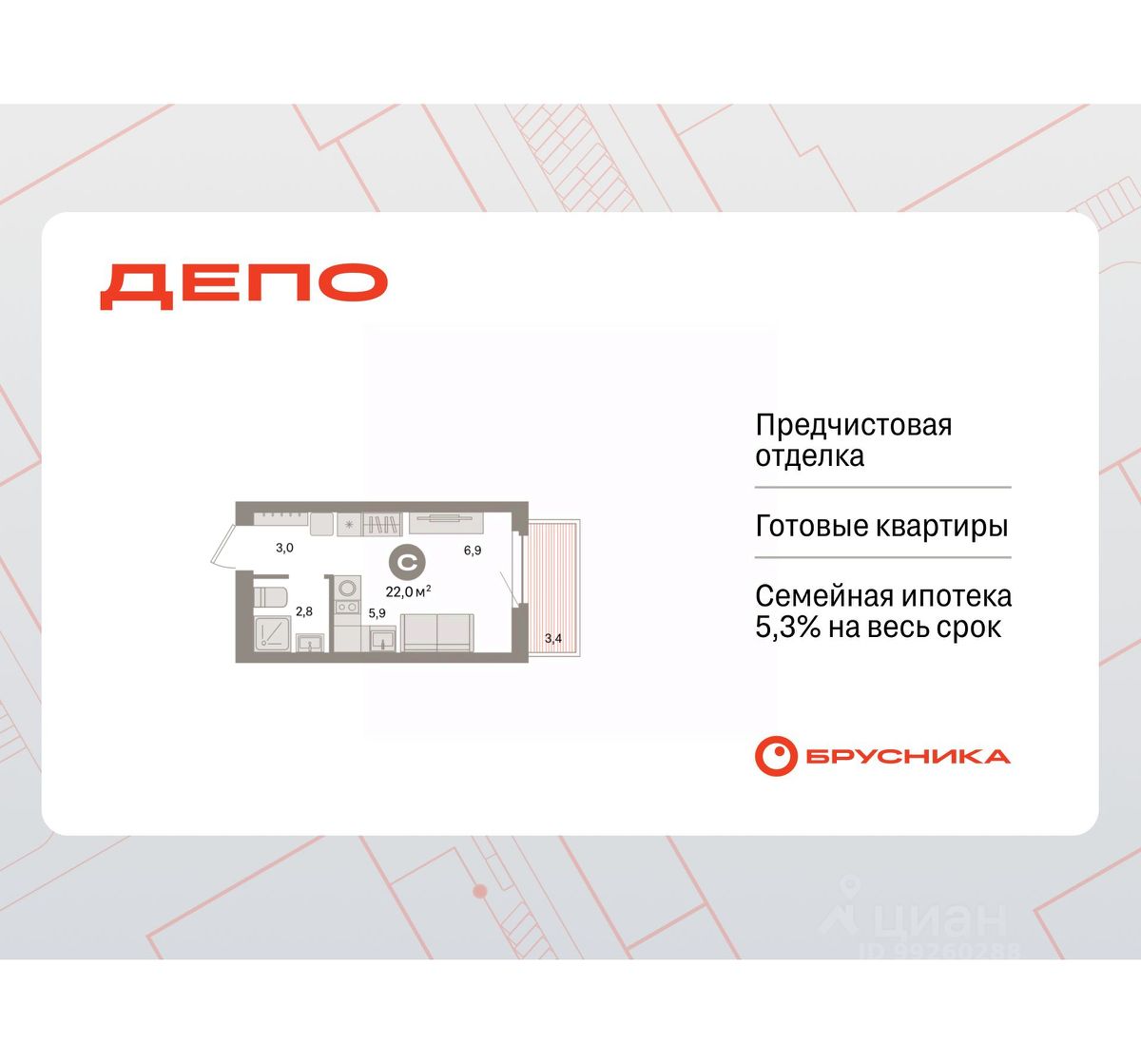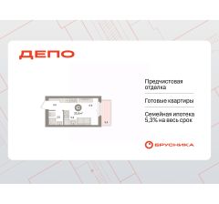 Студия в квартале "Депо". Особенности планировки: предчистовая отделка, балкон.