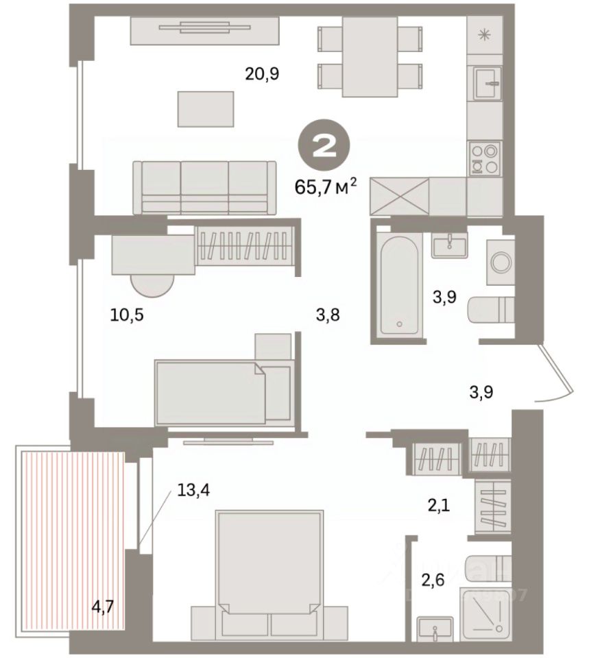 Квартира с кухней-гостиной и двумя спальнями в квартале "Депо". Особенности планировки: гардеробная, предчистовая отделка, мастер-спальня, балкон.