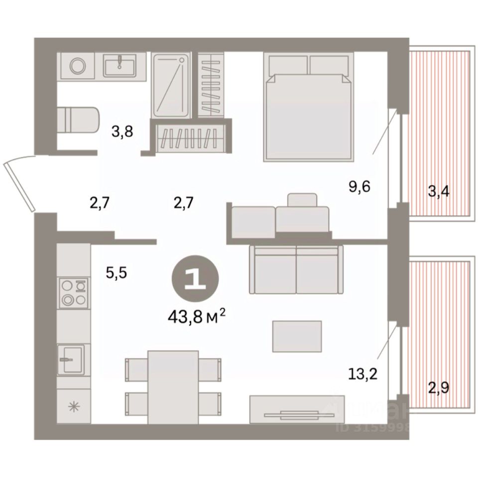 Квартира с кухней-гостиной и одной спальней в квартале "Депо". Особенности планировки: предчистовая отделка, балкон.
