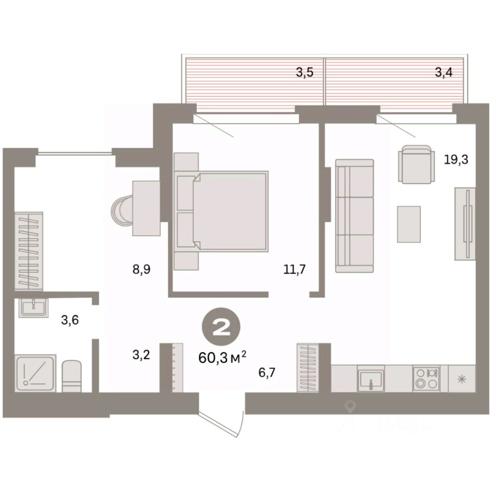 Квартира с кухней-гостиной и одной спальней в квартале "Депо". Особенности планировки: гардеробная, рабочий кабинет, предчистовая отделка, мастер-спальня, балкон.
