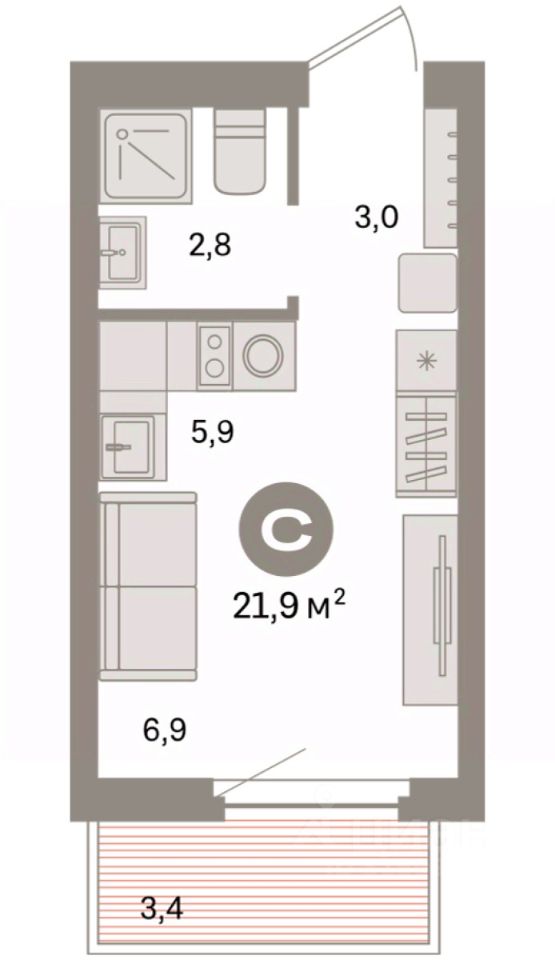 Студия в квартале "Депо". Особенности планировки: предчистовая отделка, балкон.