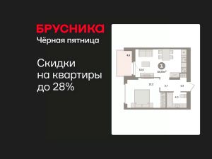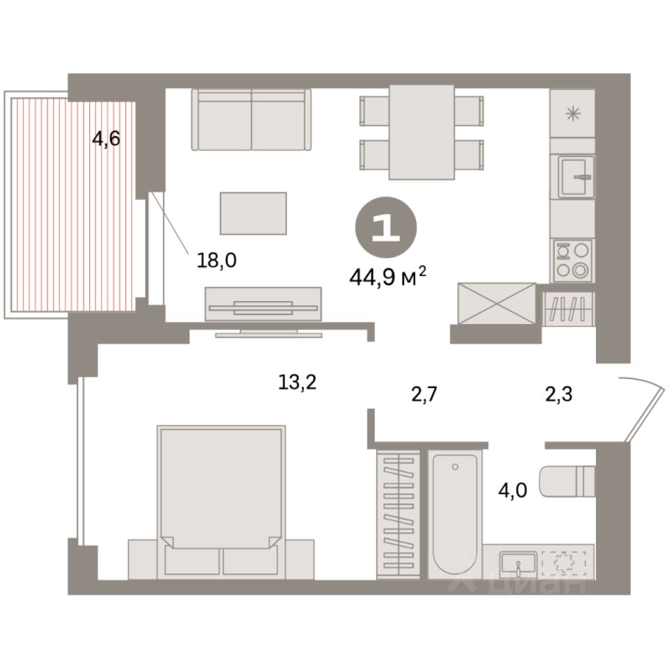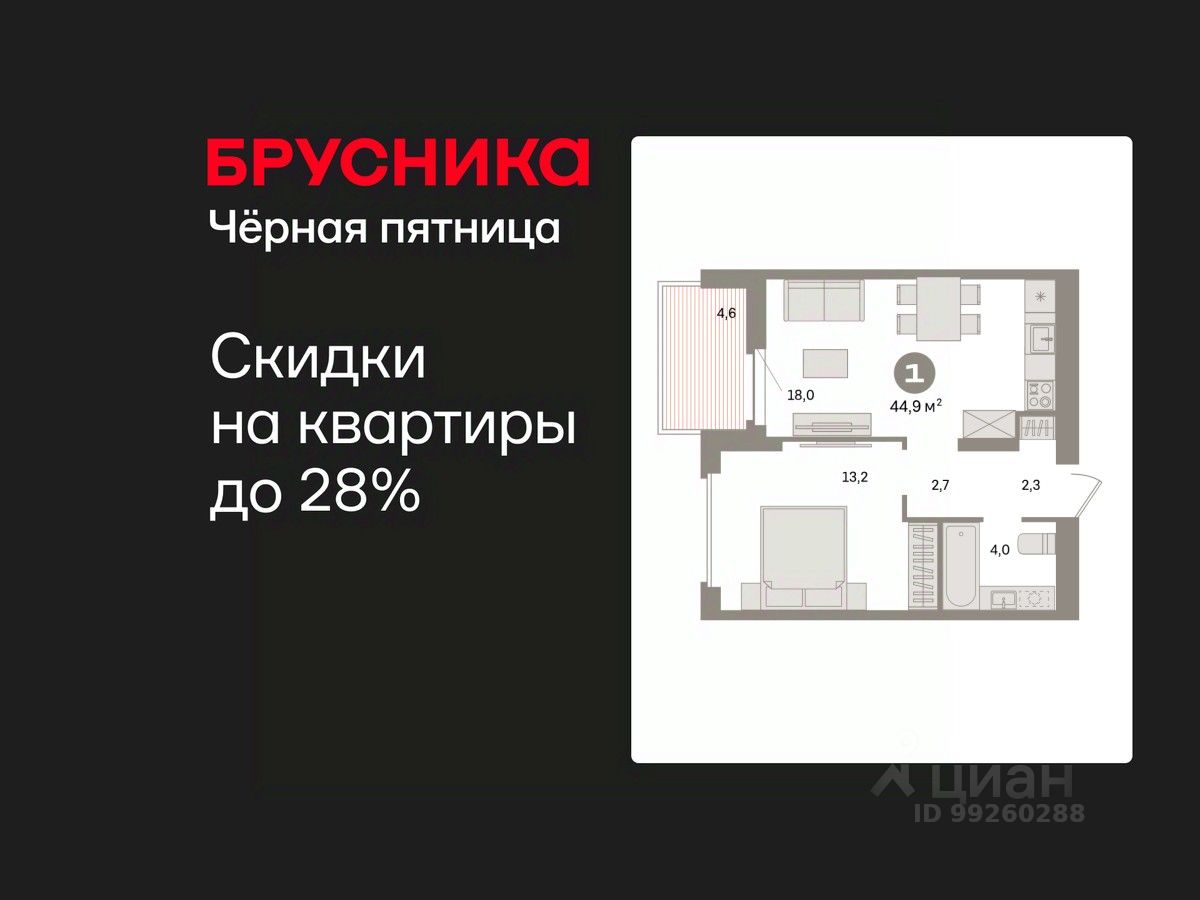 Квартира с кухней-гостиной и одной спальней в квартале "Депо". Особенности планировки: предчистовая отделка, балкон.