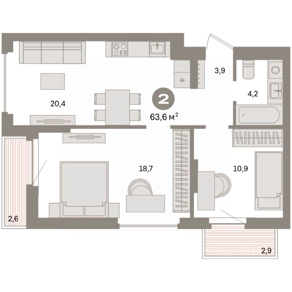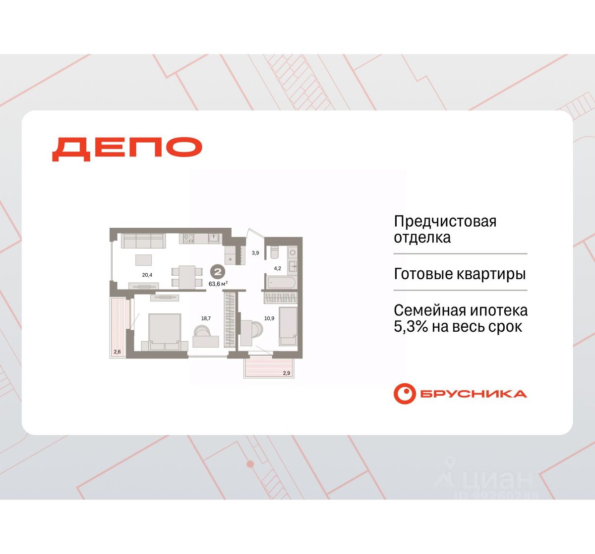 Квартира с кухней-гостиной и двумя спальнями в квартале "Депо". Особенности планировки: лоджия, предчистовая отделка, балкон.