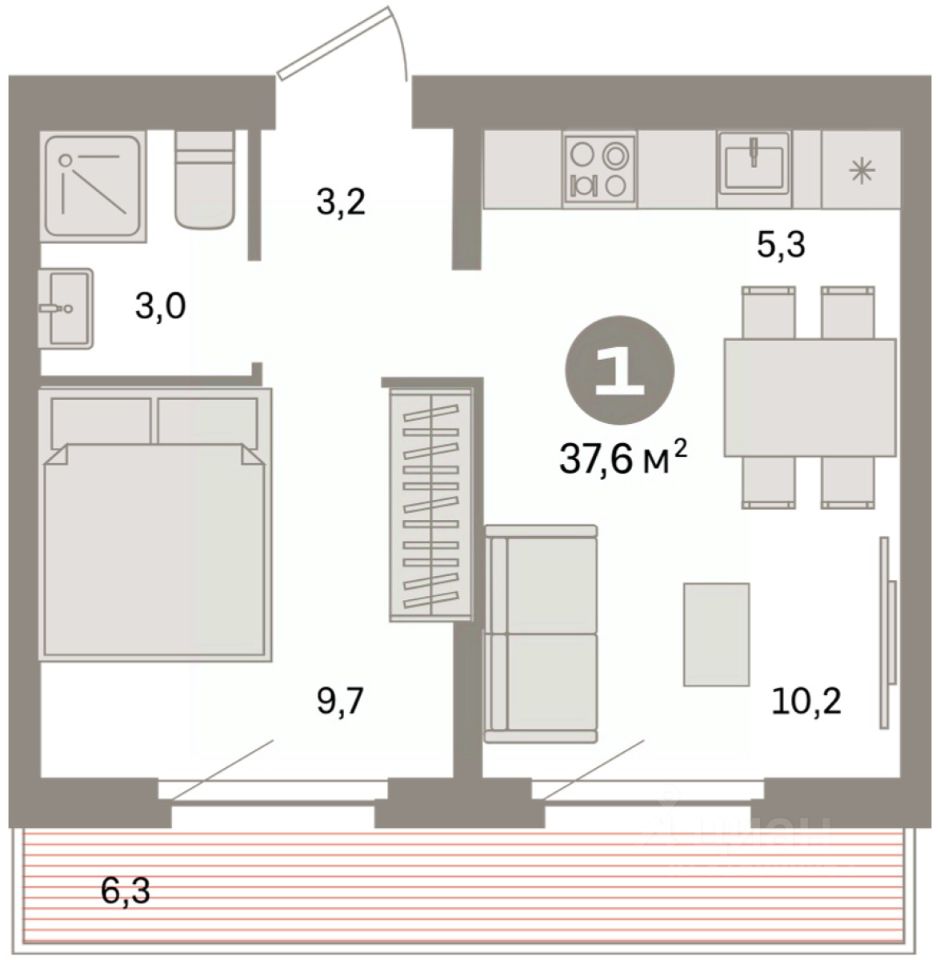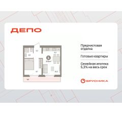 Квартира с кухней-гостиной и одной спальней в квартале "Депо". Особенности планировки: предчистовая отделка, терраса на крыше.