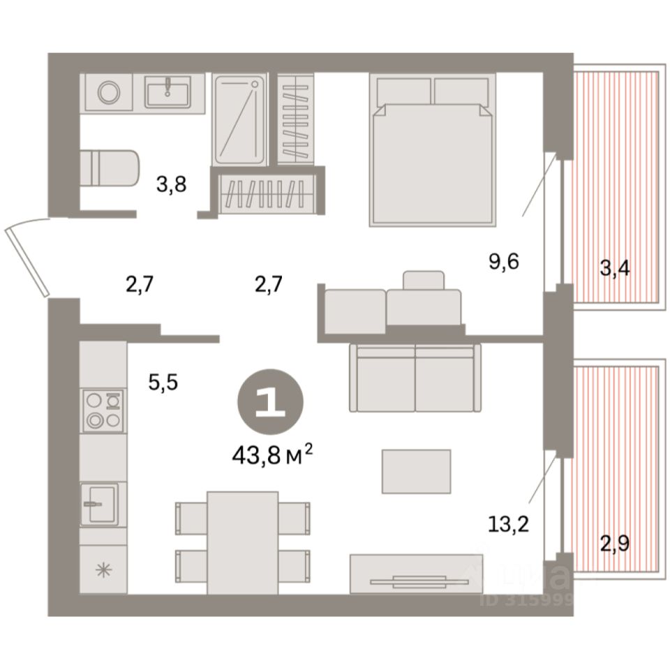 Квартира с кухней-гостиной и одной спальней в квартале "Депо". Особенности планировки: предчистовая отделка.