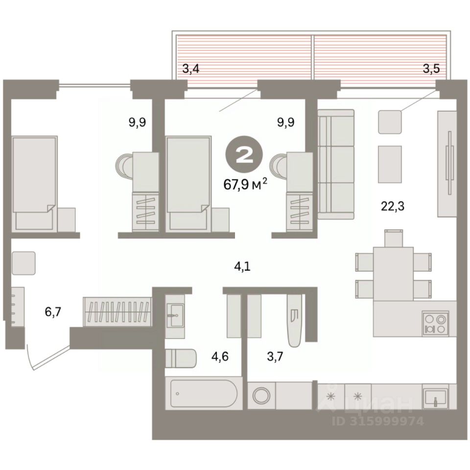 Квартира с кухней-гостиной и двумя спальнями в квартале "Депо". Особенности планировки: вид во двор, предчистовая отделка, постирочная, балкон.