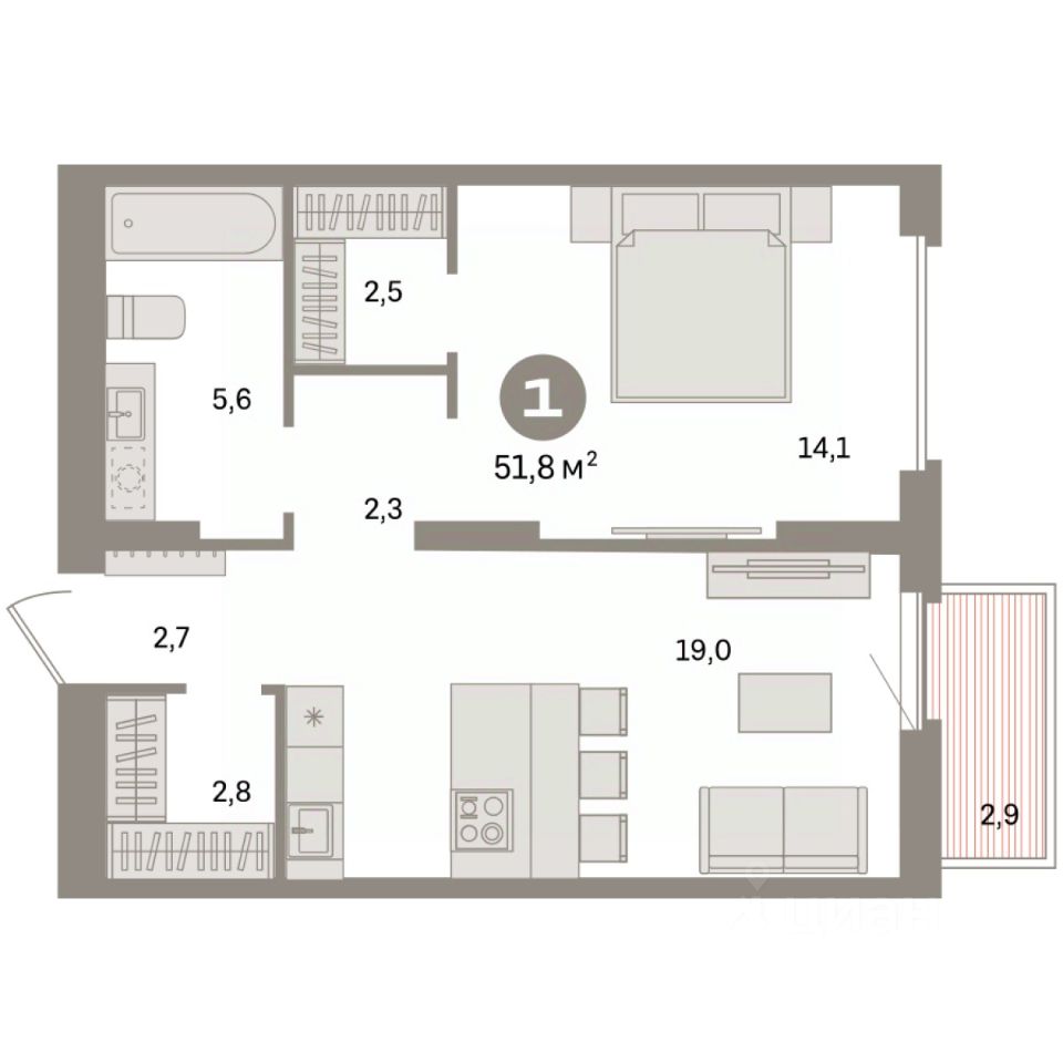 Квартира с кухней-гостиной и одной спальней в квартале "Депо". Особенности планировки: гардеробная, вид во двор, предчистовая отделка, балкон.
