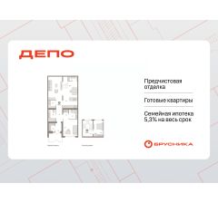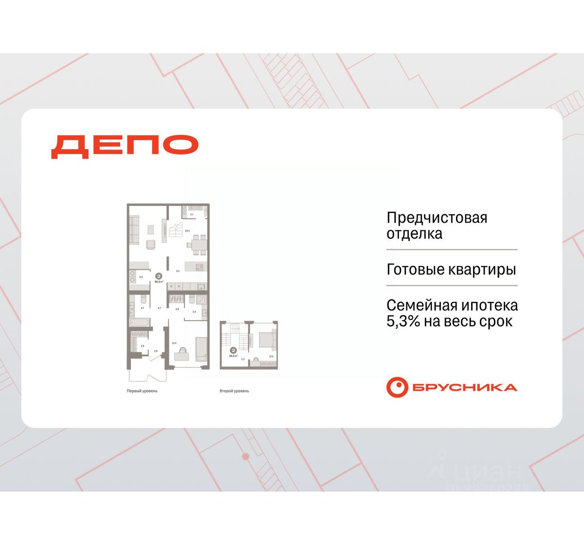 Двухуровневая квартира с кухней-гостиной и двумя спальнями в квартале "Депо". Особенности планировки: вид во двор, гардеробная, двухуровневая, мастер-спальня, окна в пол, окна на две стороны, отдельный вход, панорамное остекление, постирочная, предчистовая отделка, разнесённые спальни.