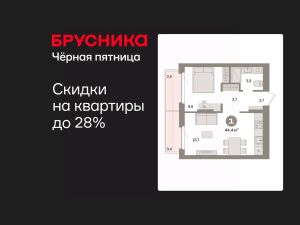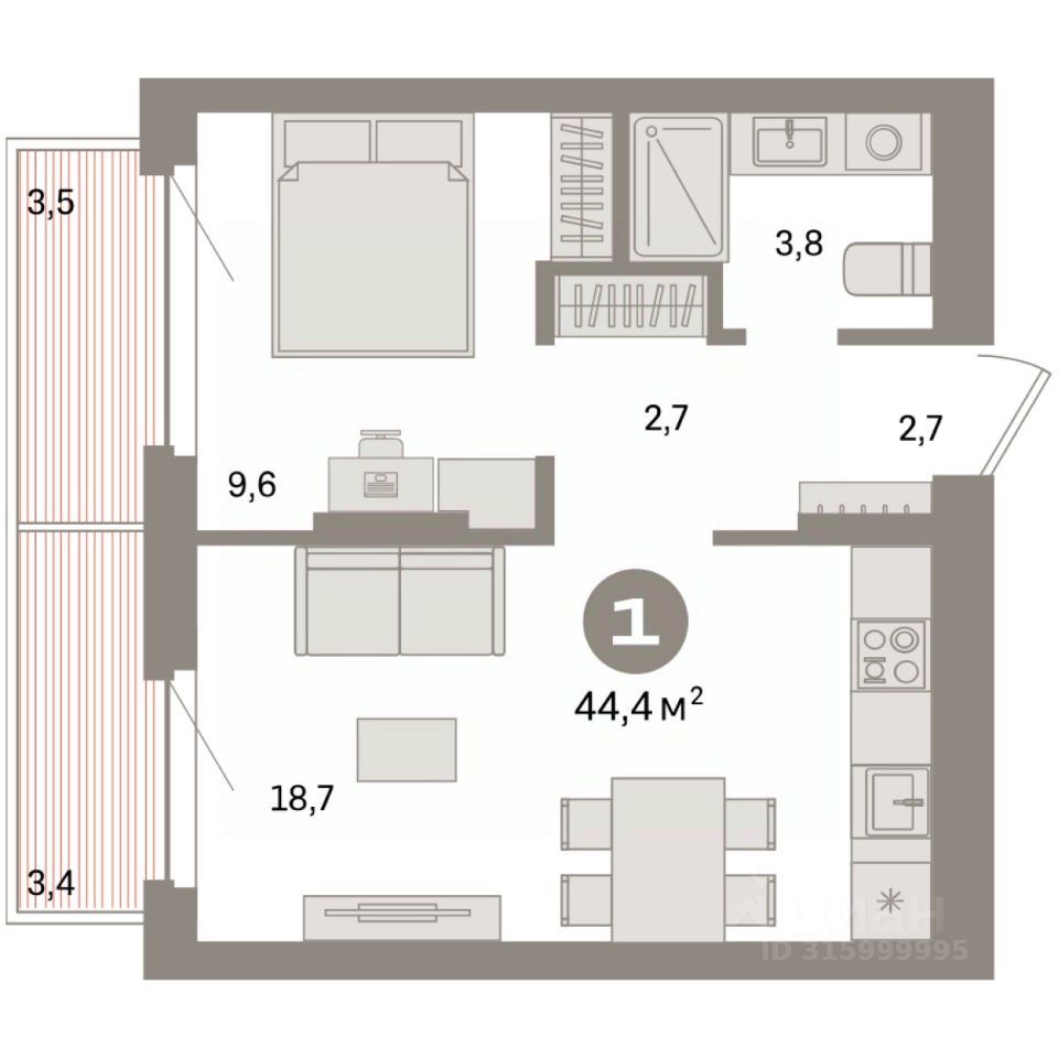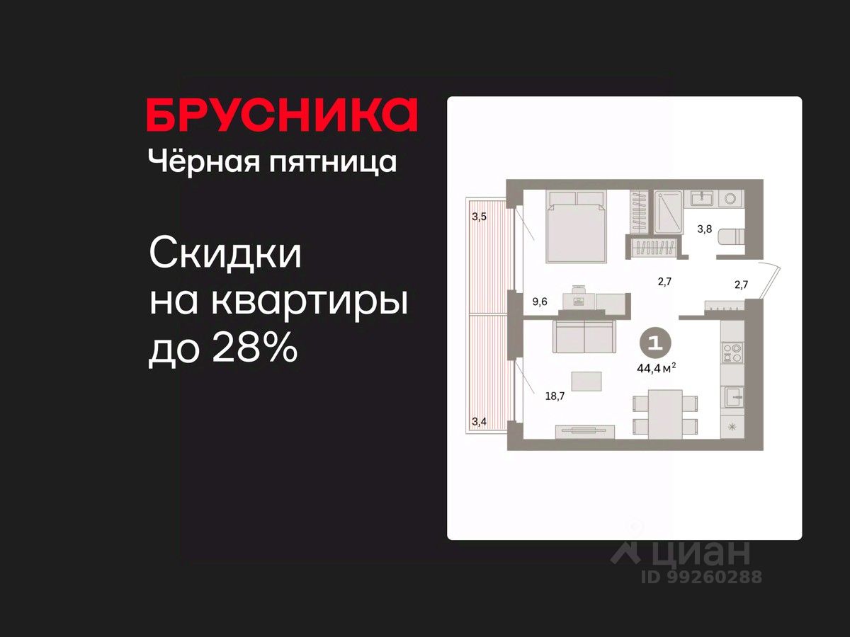 Квартира с кухней-гостиной и одной спальней в квартале "Депо". Особенности планировки: предчистовая отделка, балкон.