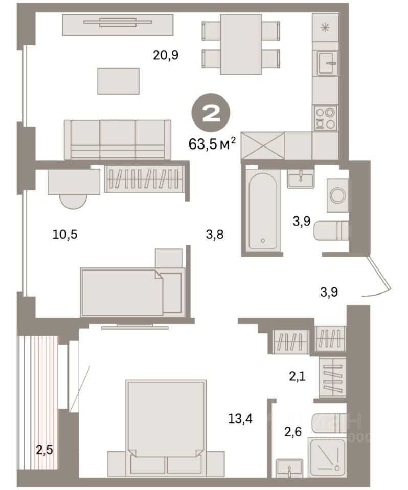 Квартира с кухней-гостиной и двумя спальнями в квартале "Депо". Особенности планировки: гардеробная, лоджия, предчистовая отделка, мастер-спальня.