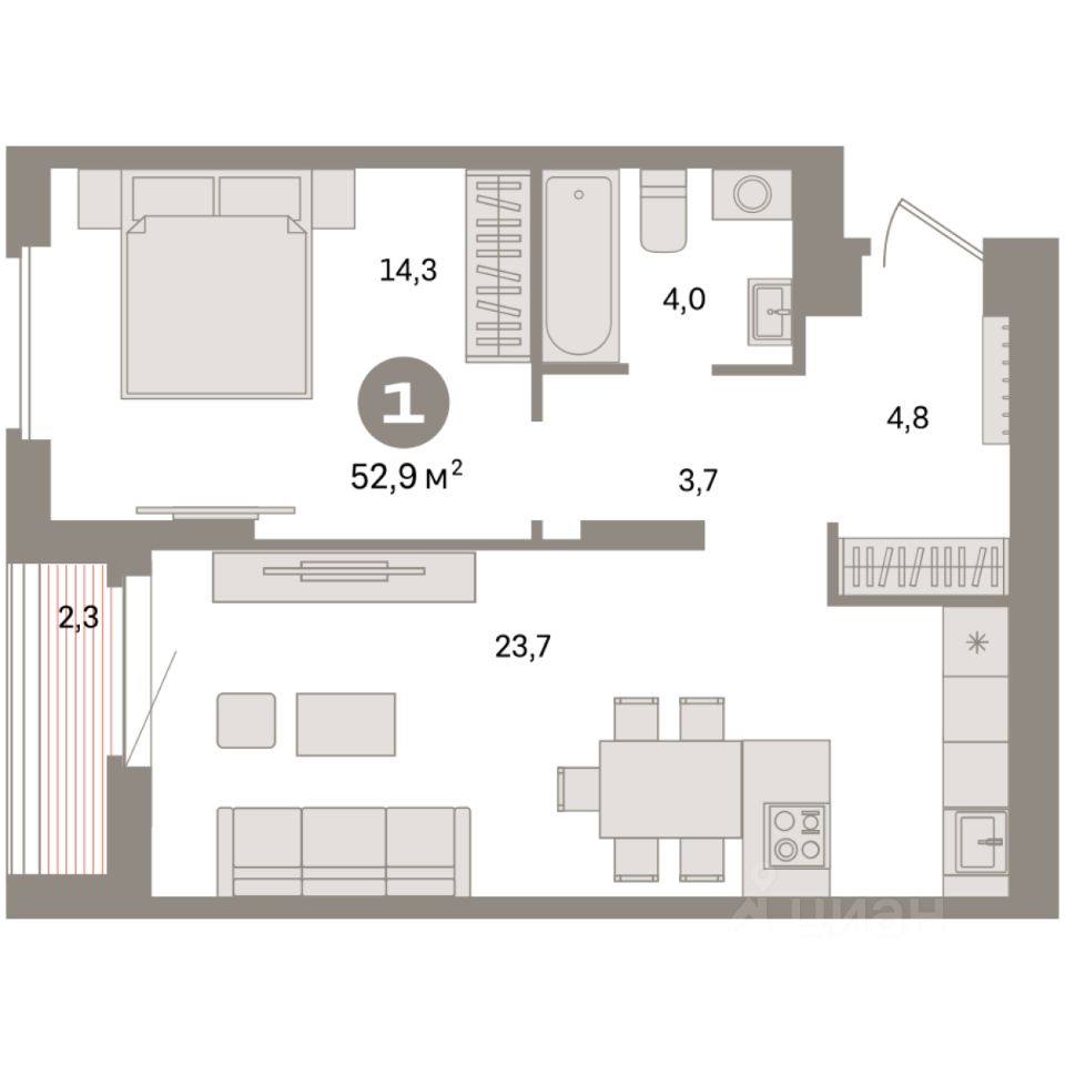 Квартира с кухней-гостиной и одной спальней в квартале "Депо". Особенности планировки: лоджия, предчистовая отделка.