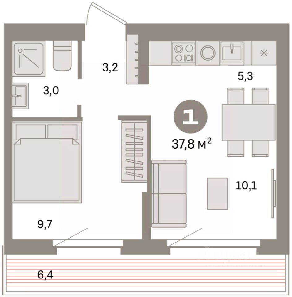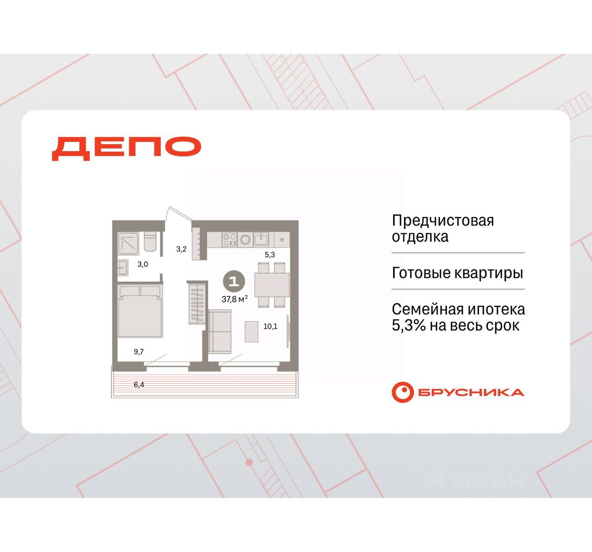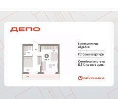 Квартира с кухней-гостиной и одной спальней в квартале "Депо". Особенности планировки: предчистовая отделка, терраса на крыше.