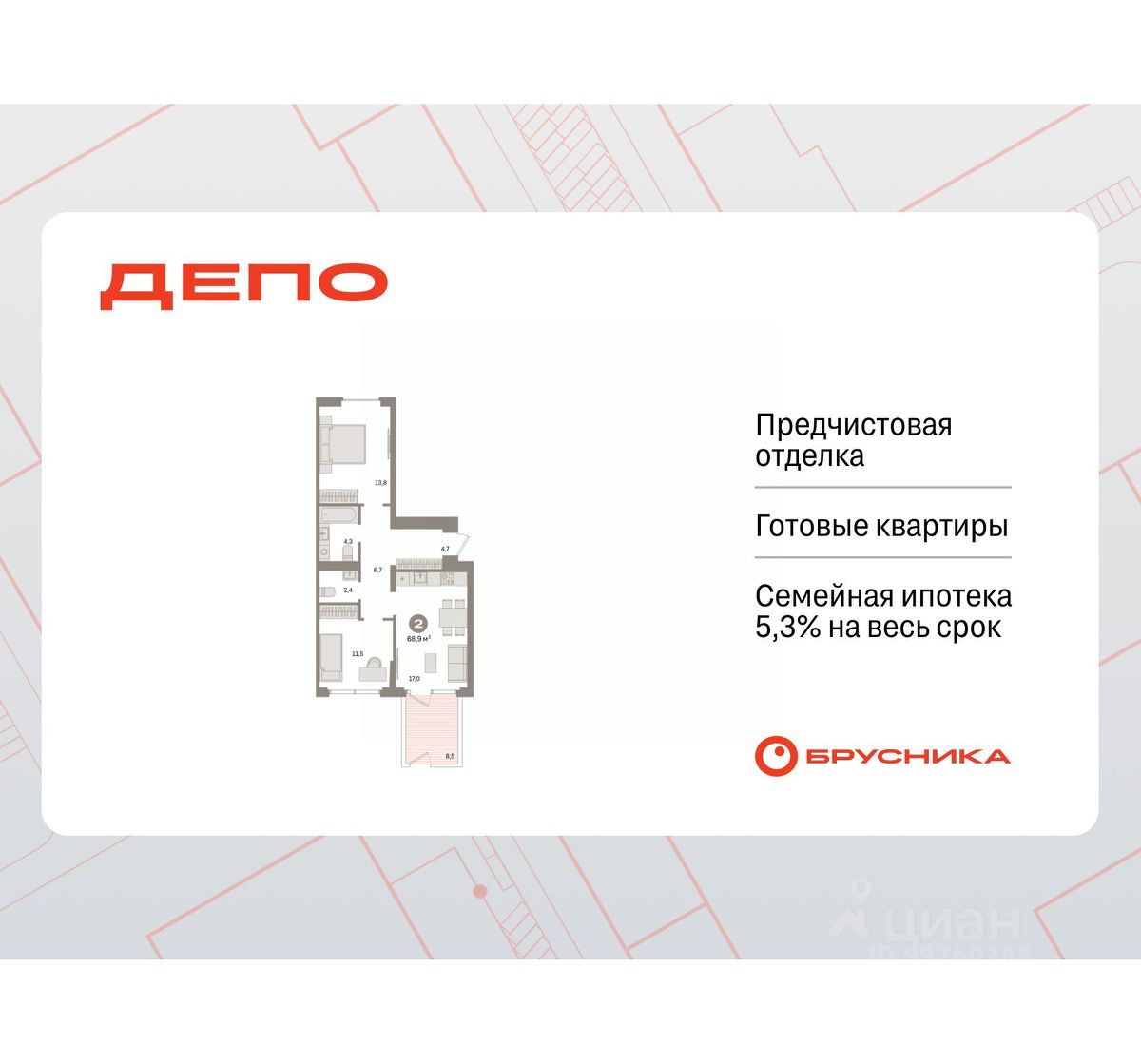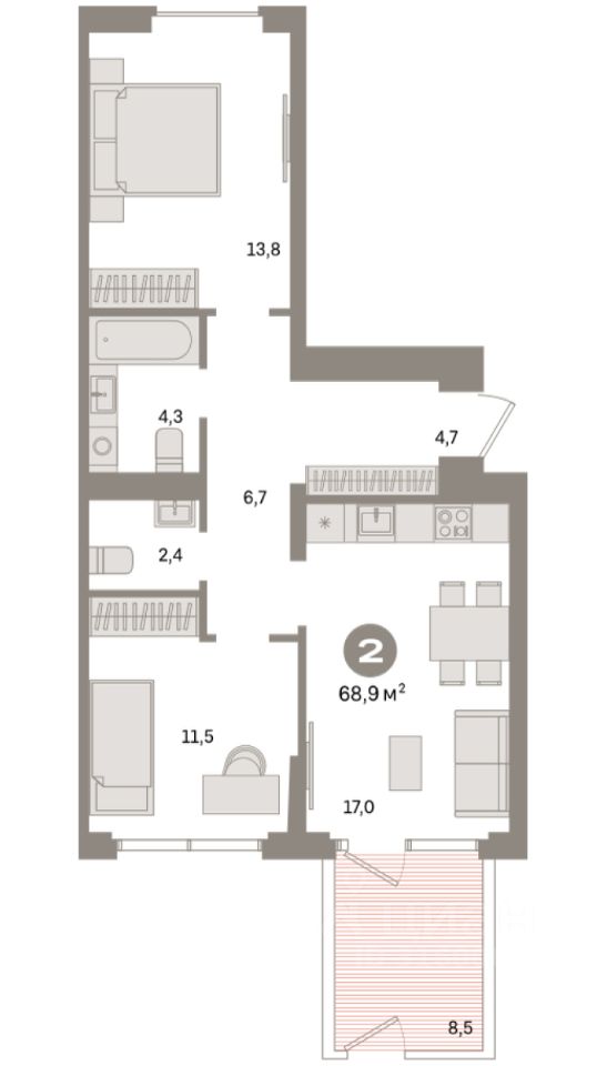 Квартира с кухней-гостиной и двумя спальнями в квартале "Депо". Особенности планировки: окна на две стороны, второй санузел, окна в пол, вид во двор, панорамное остекление, разнесённые спальни, предчистовая отделка, терраса.