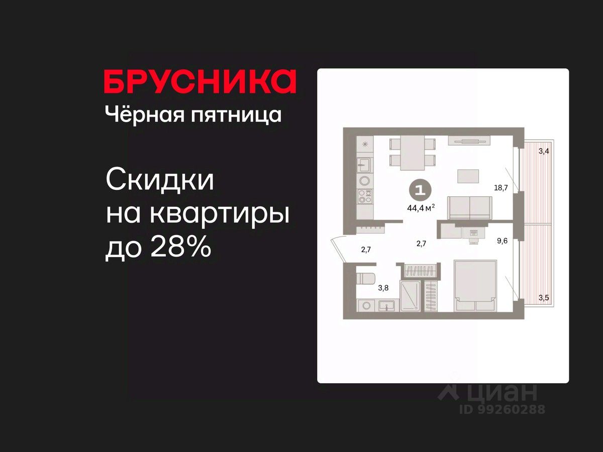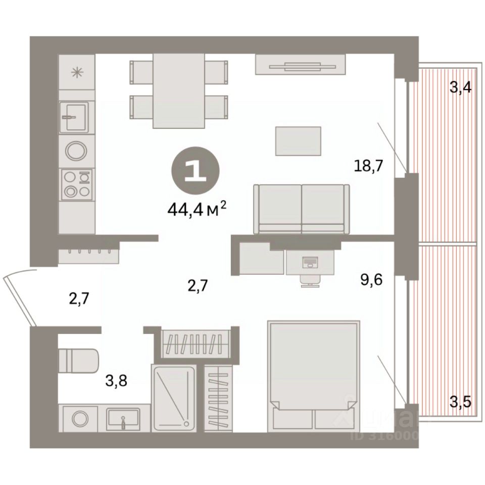 Квартира с кухней-гостиной и одной спальней в квартале "Депо". Особенности планировки: предчистовая отделка, балкон.