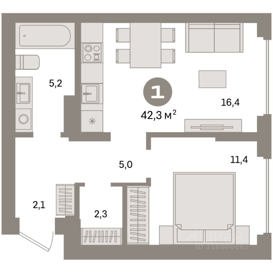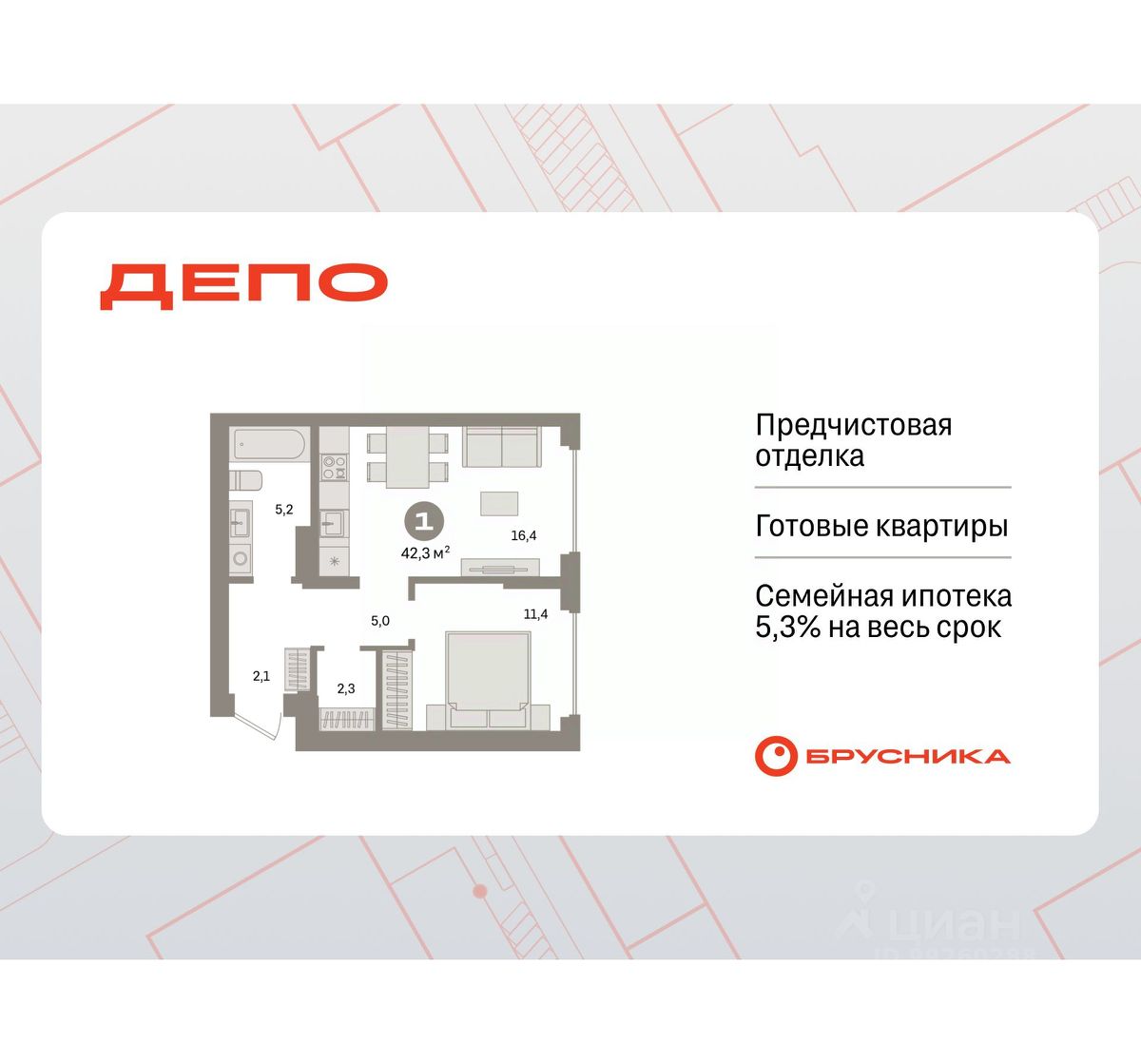 Квартира с кухней-гостиной и одной спальней в квартале "Депо". Особенности планировки: гардеробная, вид во двор, предчистовая отделка.