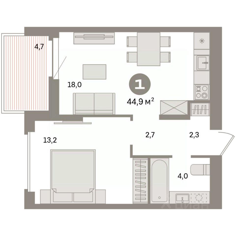 Квартира с кухней-гостиной и одной спальней в квартале "Депо". Особенности планировки: предчистовая отделка, балкон.