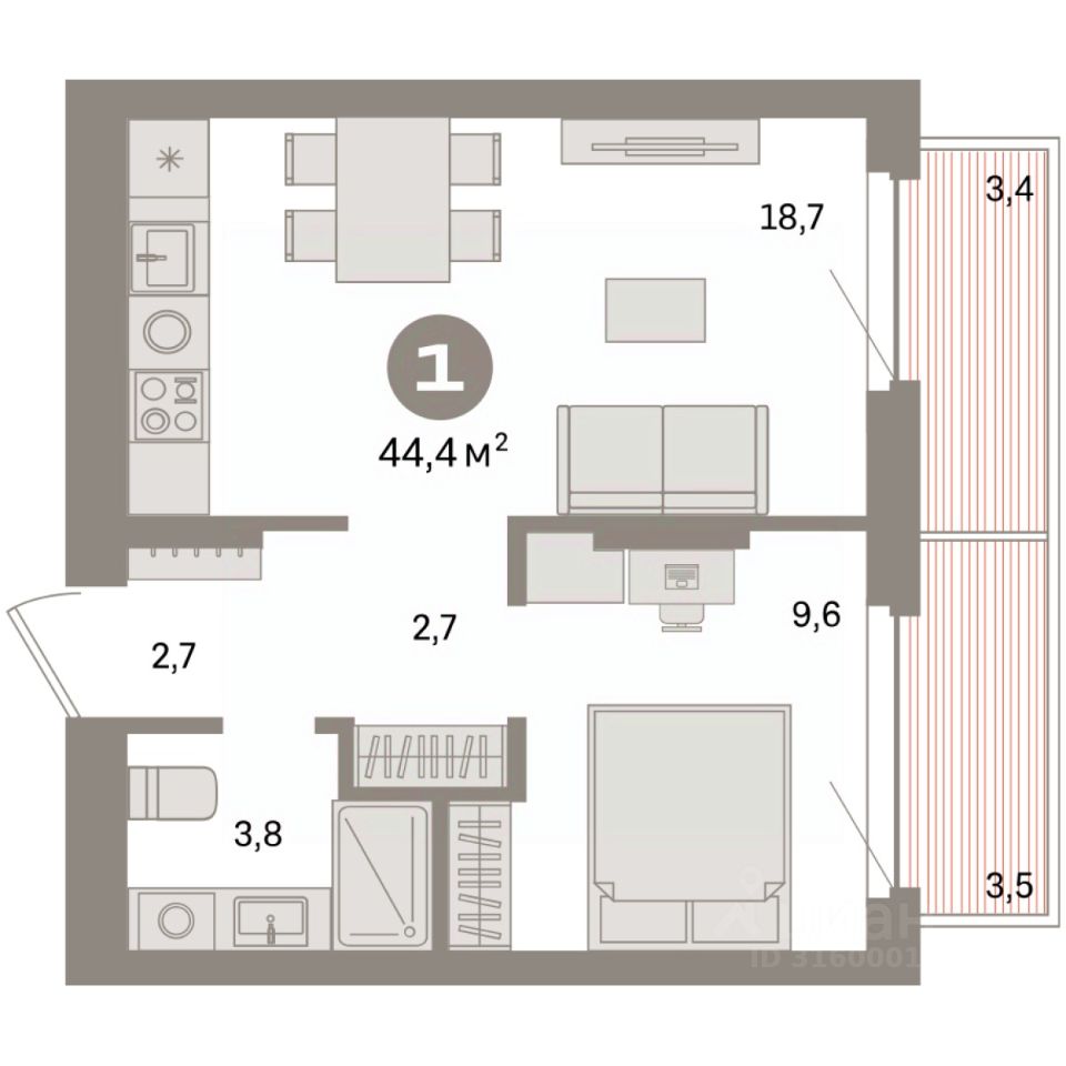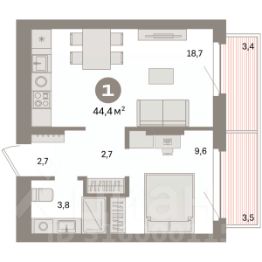 Квартира с кухней-гостиной и одной спальней в квартале "Депо". Особенности планировки: балкон, предчистовая отделка.