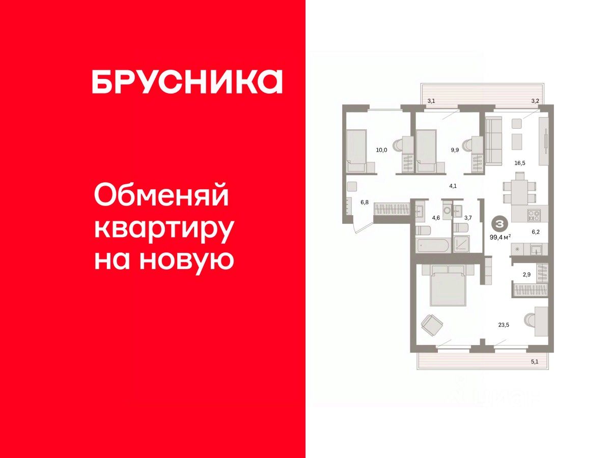 Квартира с кухней-гостиной и тремя спальнями в квартале "Депо". Особенности планировки: балкон, окна на две стороны, предчистовая отделка, разнесённые спальни, терраса на крыше.