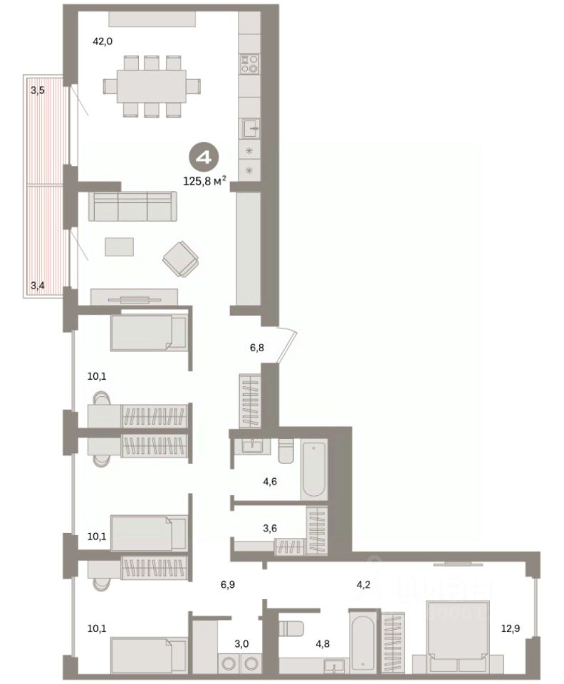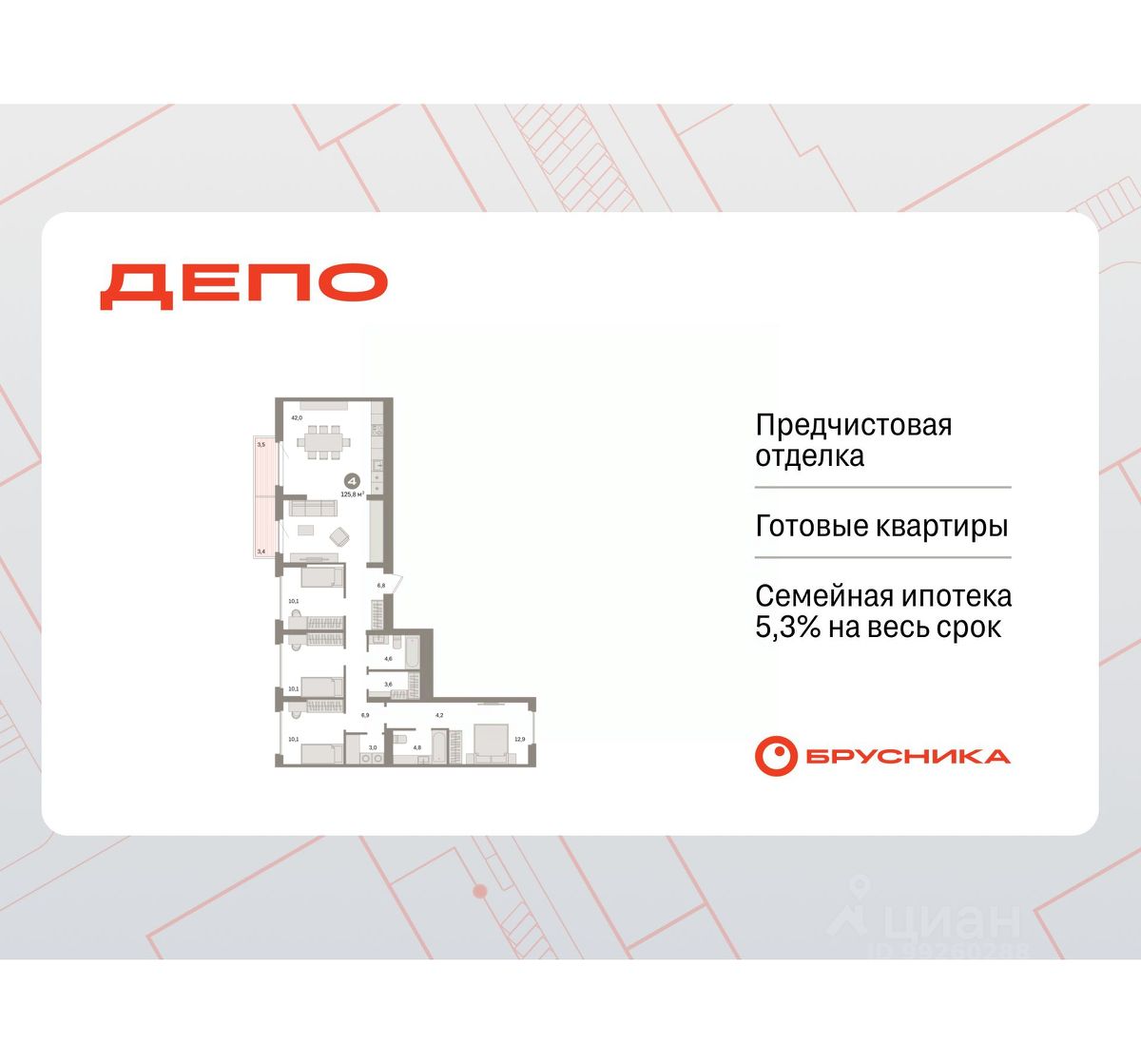 Квартира с кухней-гостиной и четырьмя спальнями в квартале "Депо". Особенности планировки: окна на две стороны, гардеробная, вид во двор, разнесённые спальни, предчистовая отделка, мастер-спальня, постирочная, балкон.