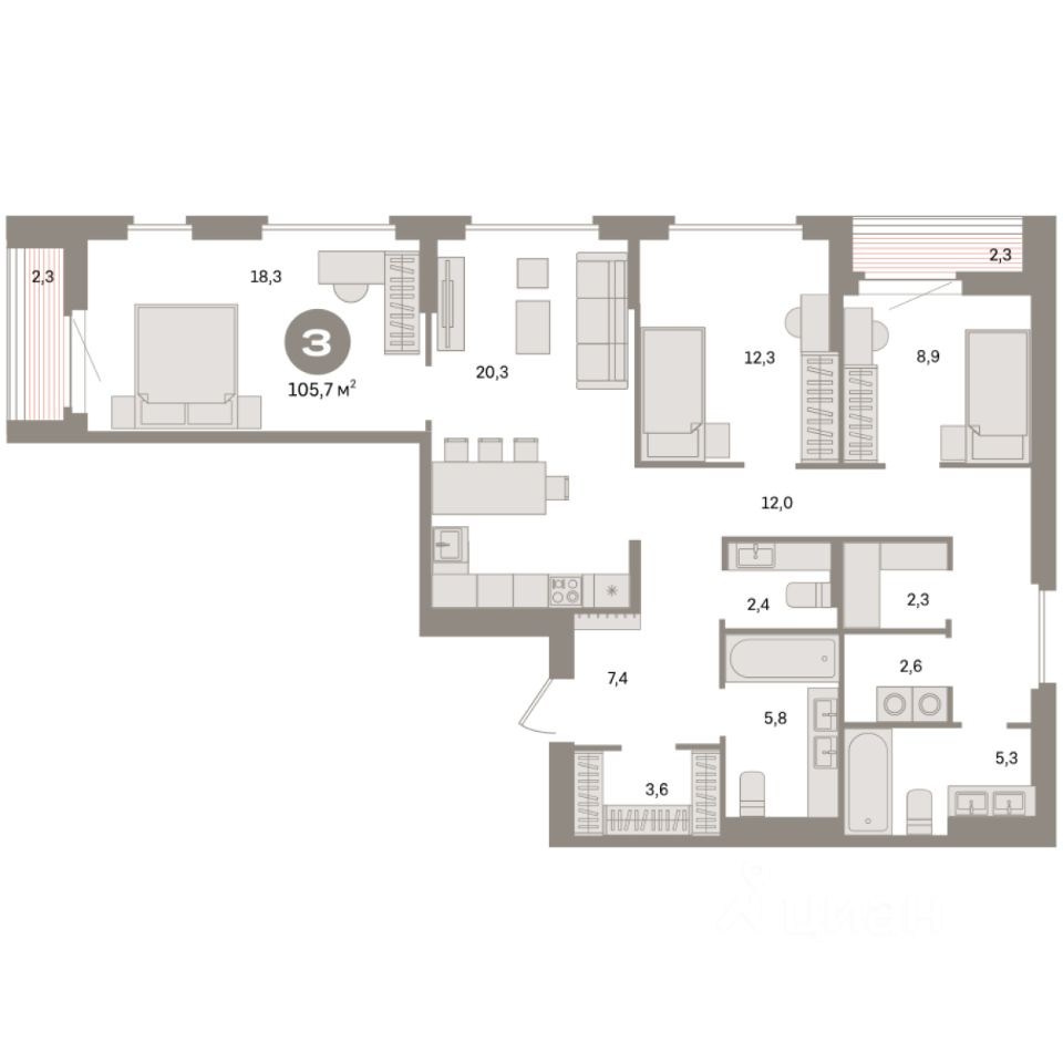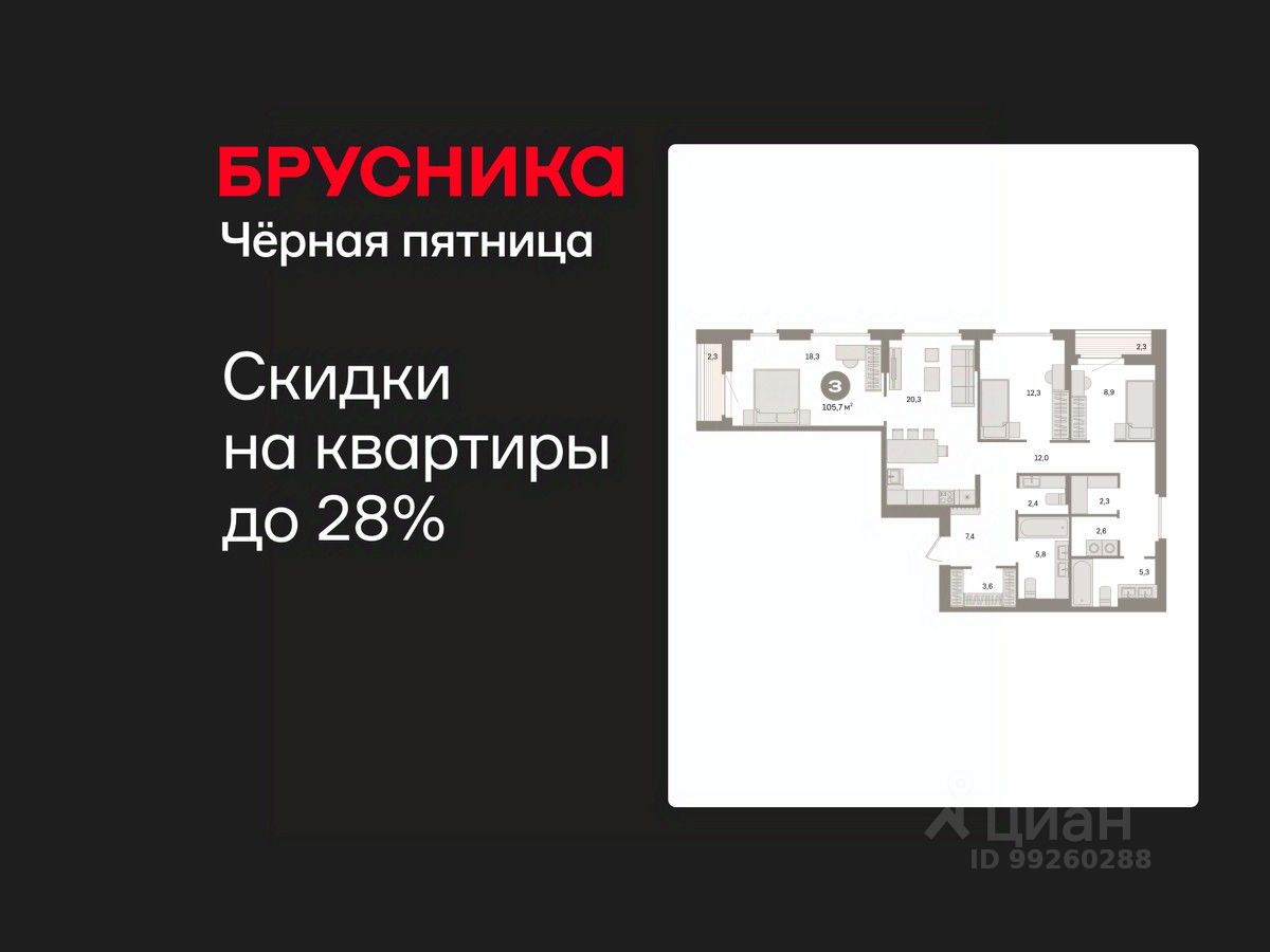 Квартира с кухней-гостиной и тремя спальнями в квартале "Депо". Особенности планировки: второй санузел, окно в коридоре, гардеробная, вид во двор, лоджия, разнесённые спальни, предчистовая отделка, постирочная.