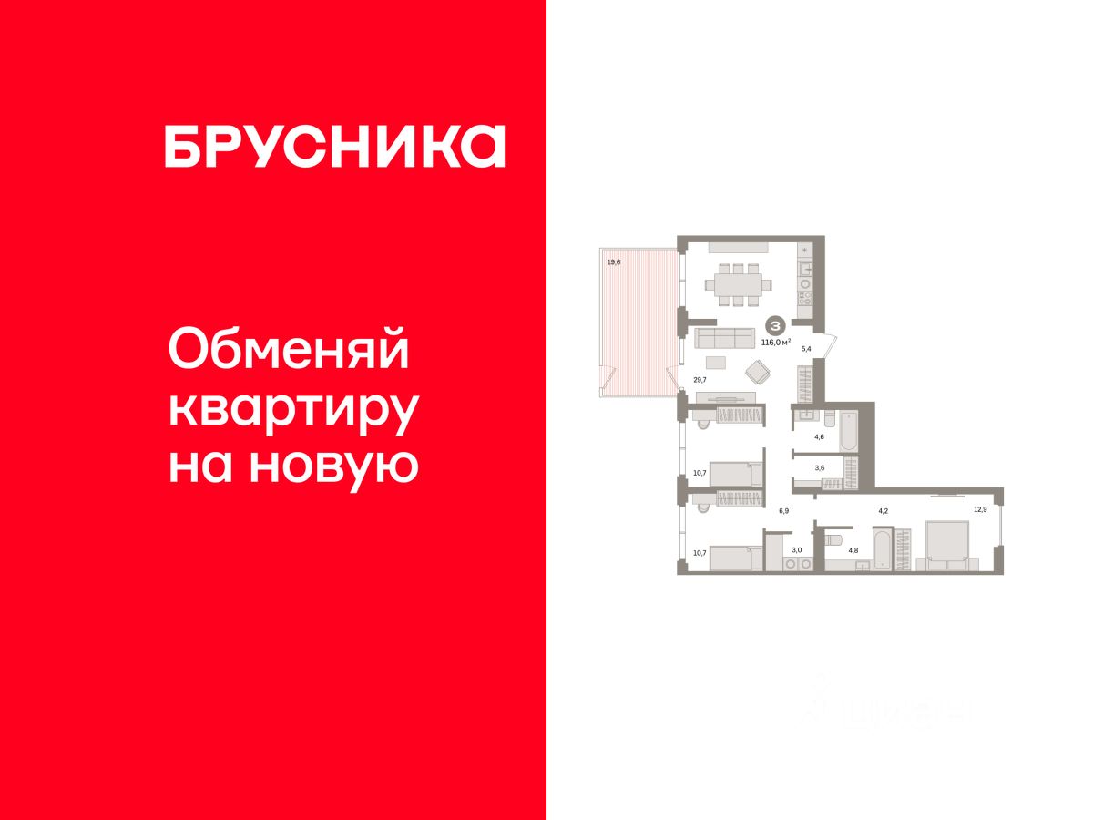 Квартира с кухней-гостиной и тремя спальнями в квартале "Депо". Особенности планировки: окна на две стороны, предчистовая отделка, разнесённые спальни.