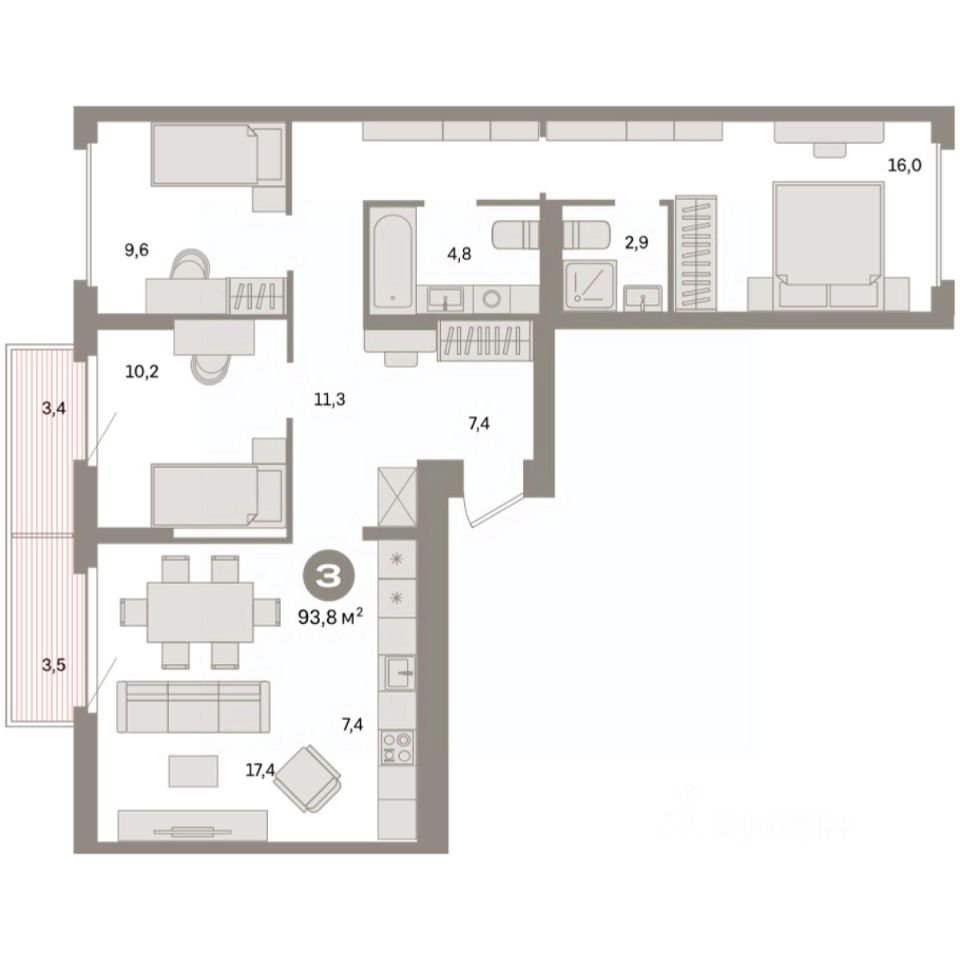 Квартира с кухней-гостиной и тремя спальнями в квартале "Депо". Особенности планировки: окна на две стороны, вид во двор, разнесённые спальни, предчистовая отделка, мастер-спальня, балкон.