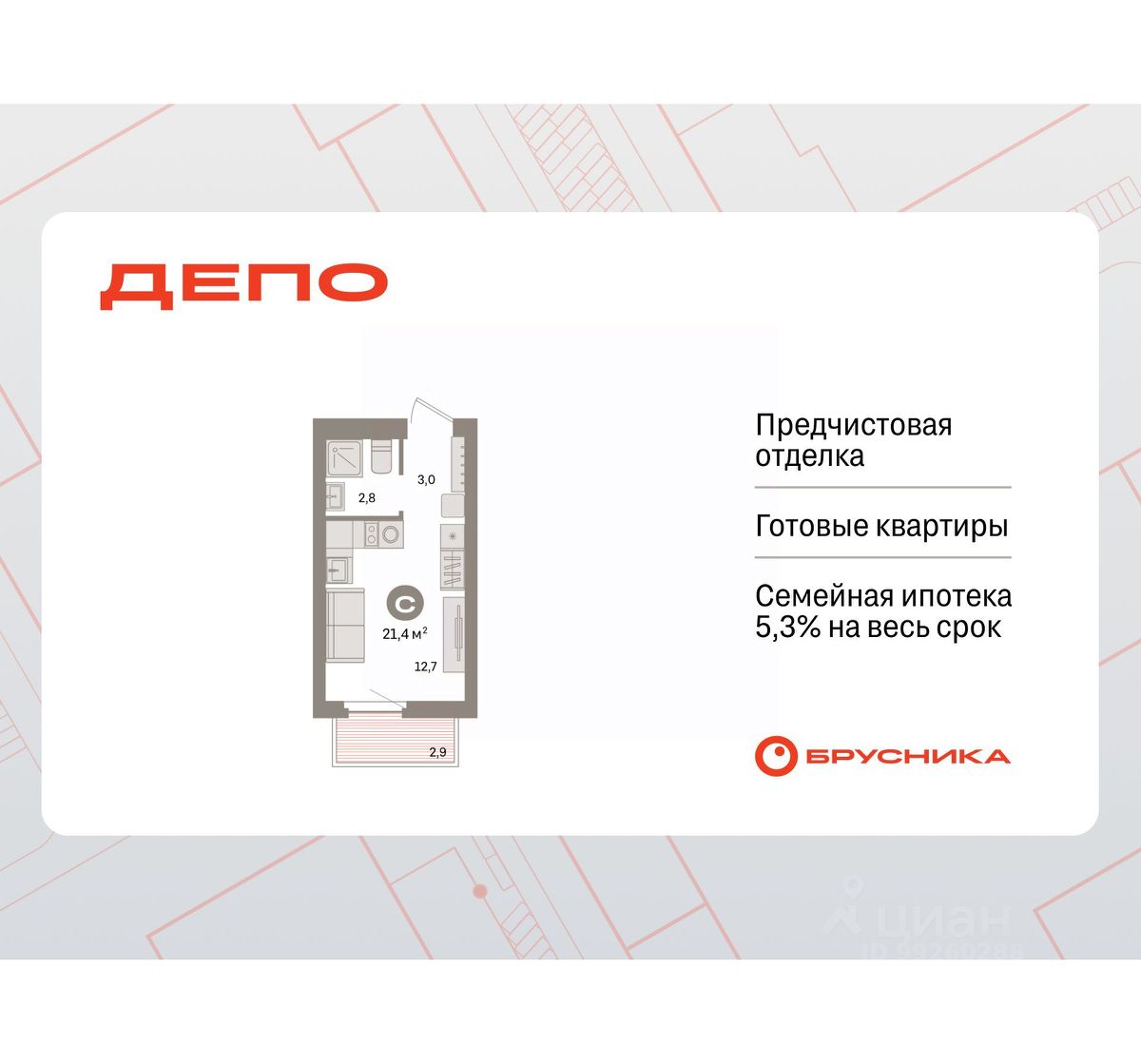 Студия в квартале "Депо". Особенности планировки: предчистовая отделка, балкон.