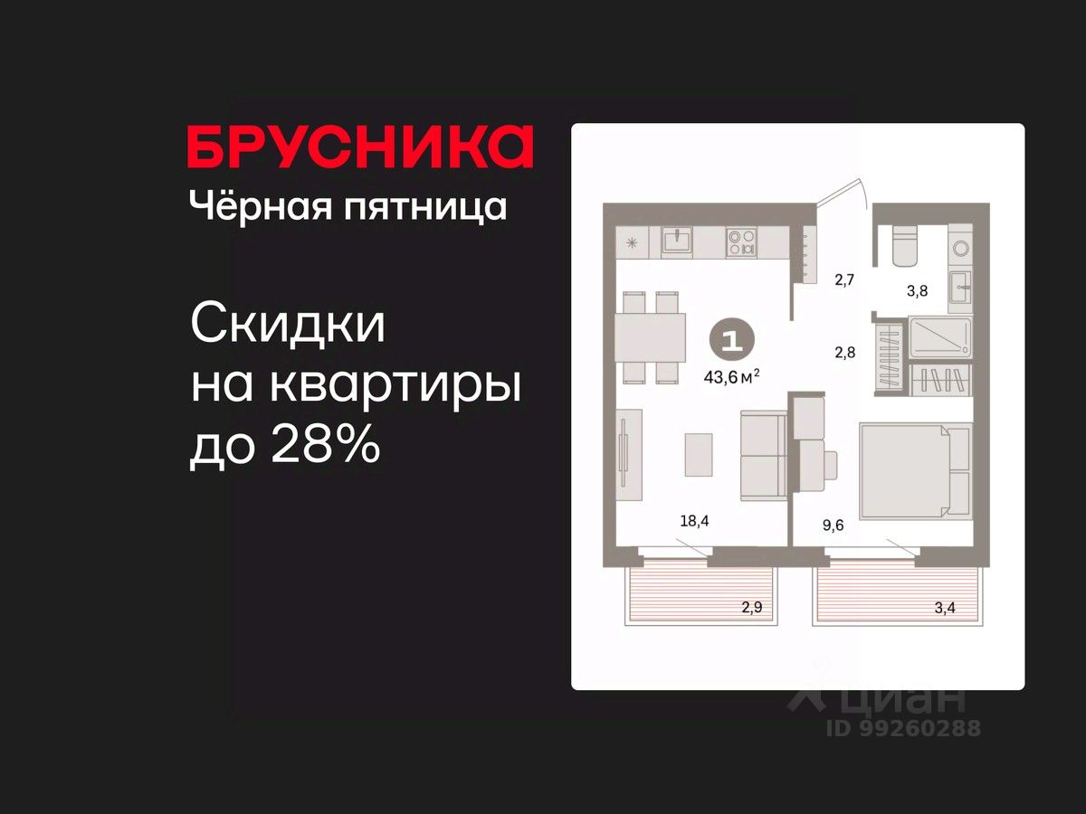 Квартира с кухней-гостиной и одной спальней в квартале "Депо". Особенности планировки: предчистовая отделка, балкон.