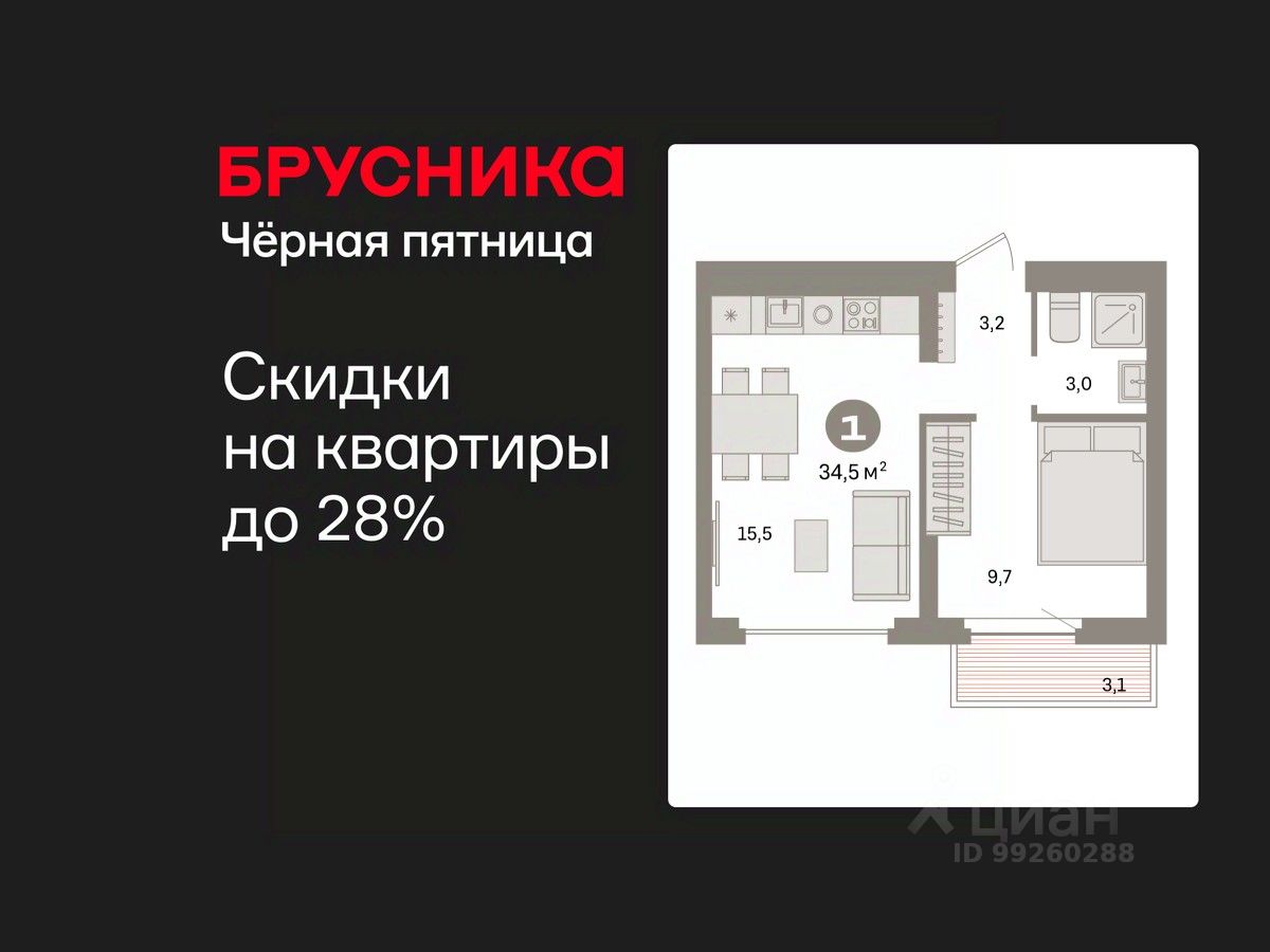 Квартира с кухней-гостиной и одной спальней в квартале "Депо". Особенности планировки: предчистовая отделка, балкон.