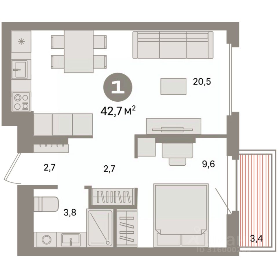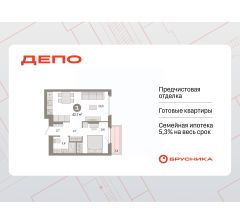 Квартира с кухней-гостиной и одной спальней в квартале "Депо". Особенности планировки: предчистовая отделка, балкон.