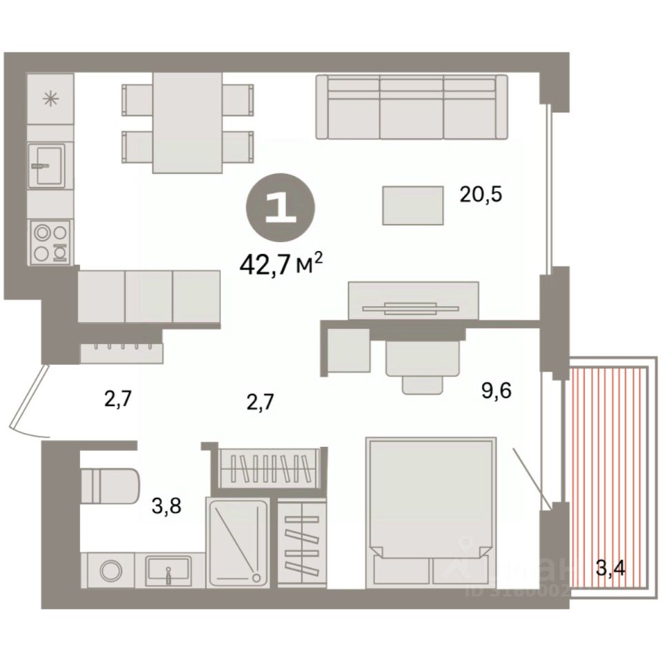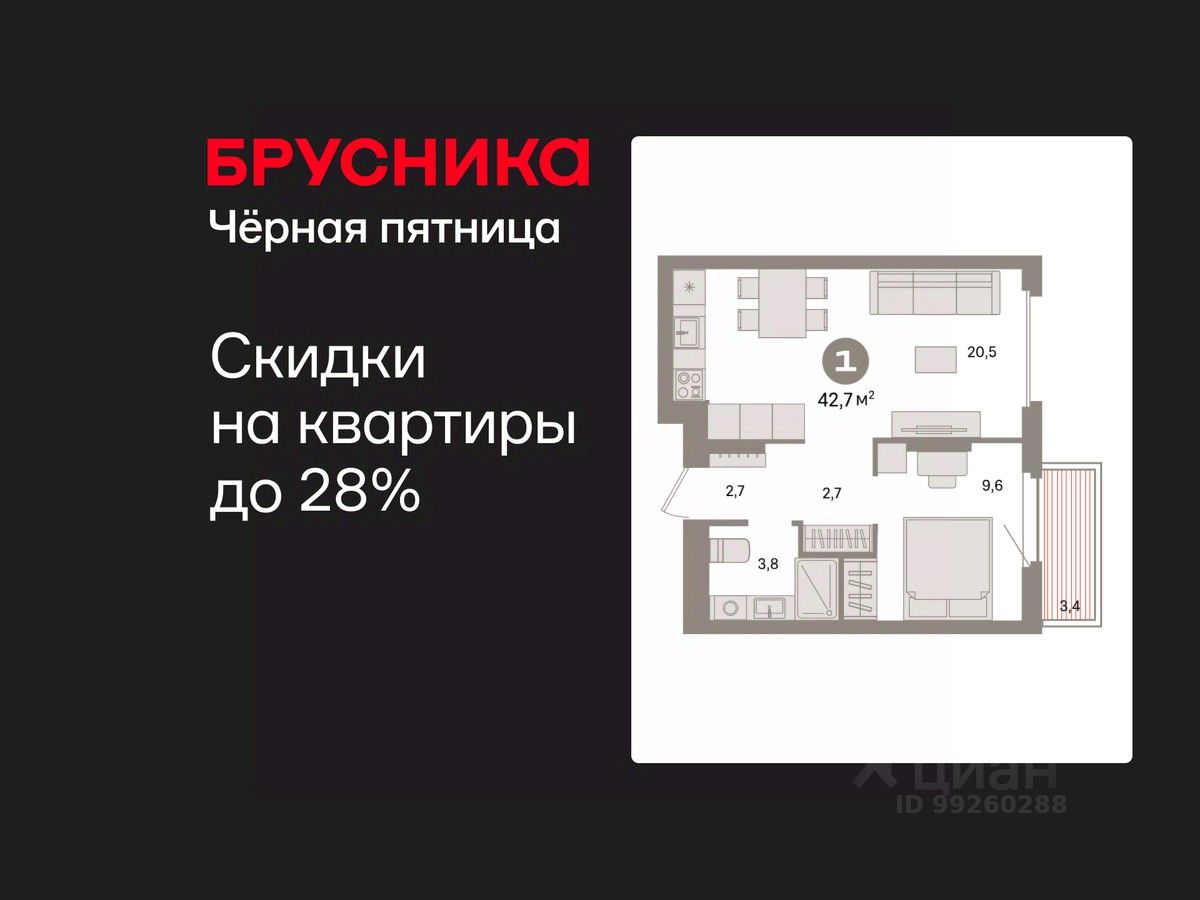 Квартира с кухней-гостиной и одной спальней в квартале "Депо". Особенности планировки: предчистовая отделка, балкон.