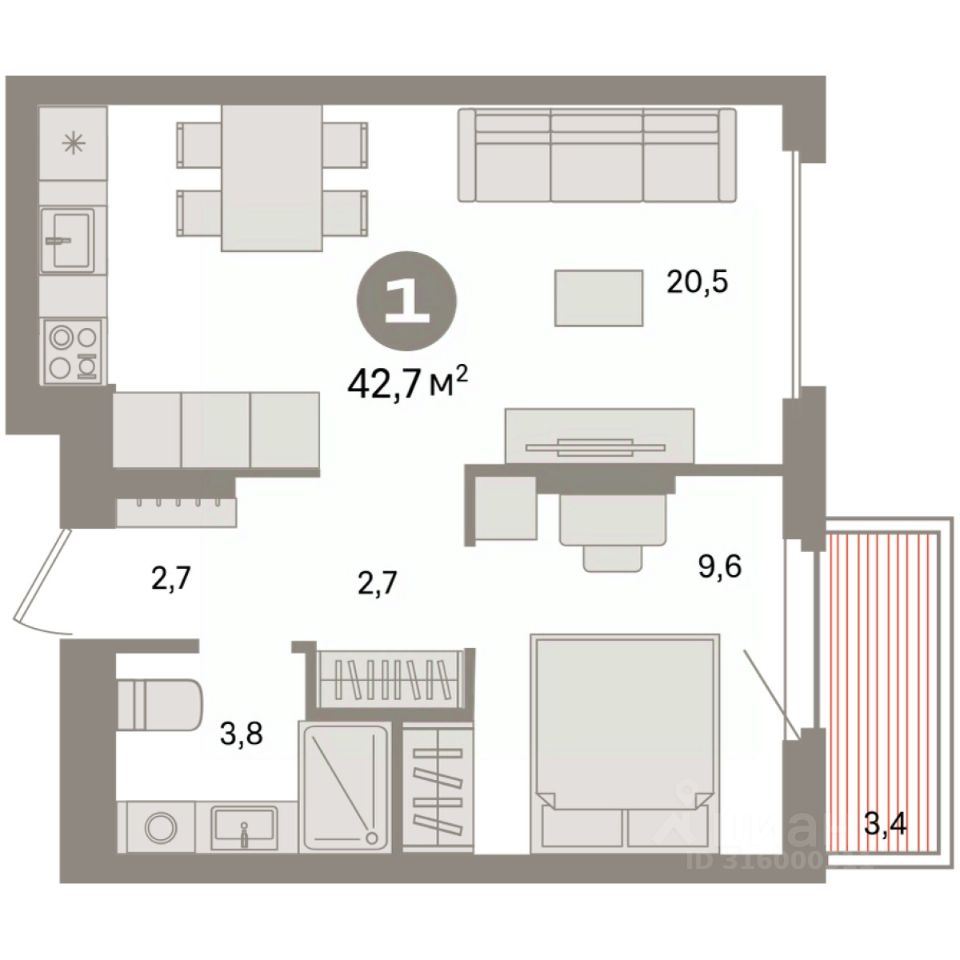 Квартира с кухней-гостиной и одной спальней в квартале "Депо". Особенности планировки: предчистовая отделка, балкон.