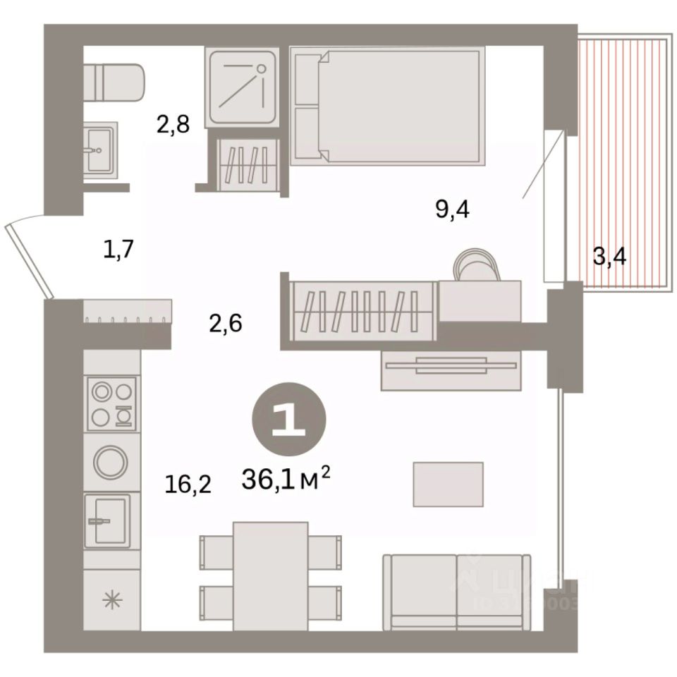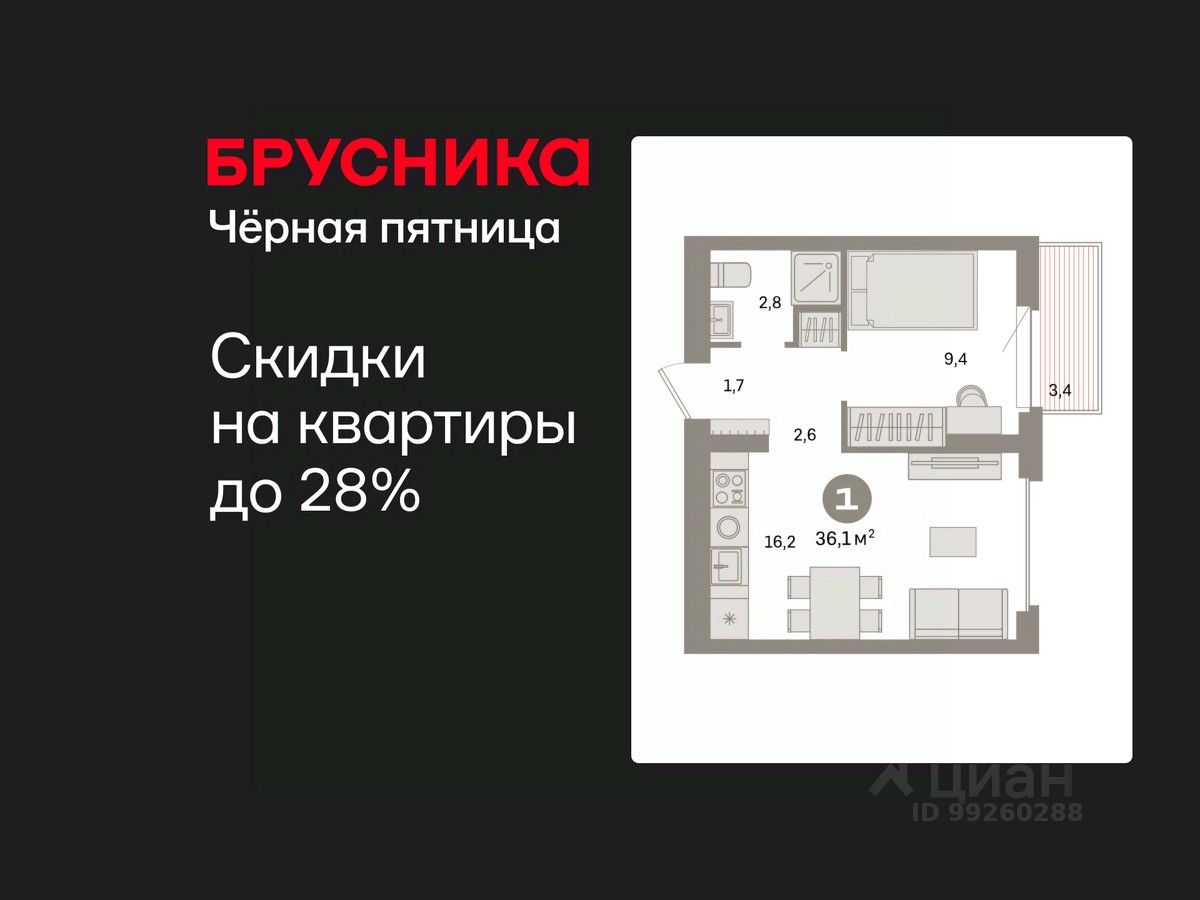 Квартира с кухней-гостиной и одной спальней в квартале "Депо". Особенности планировки: вид во двор, предчистовая отделка, балкон.