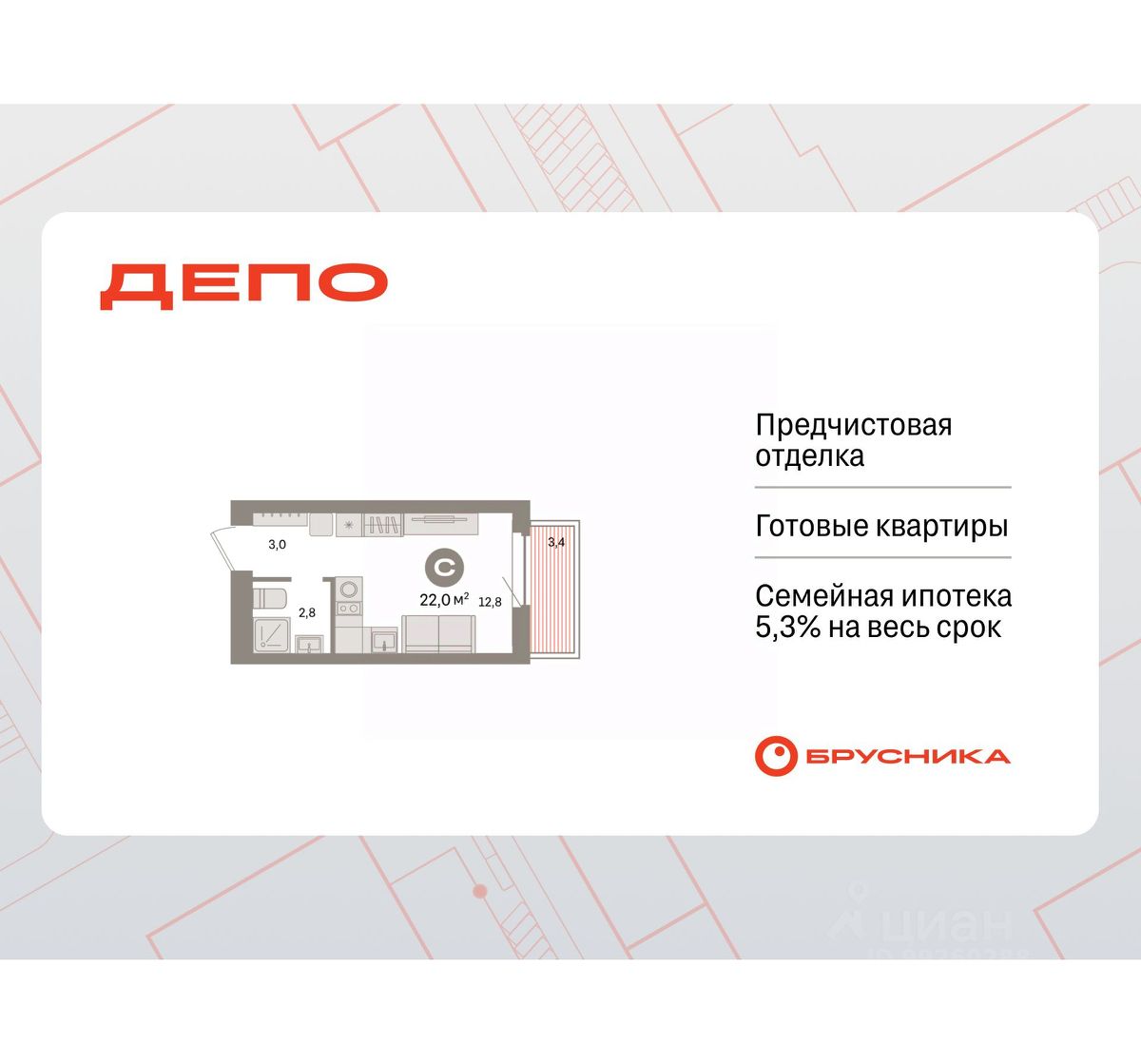 Студия в квартале "Депо". Особенности планировки: предчистовая отделка, балкон.