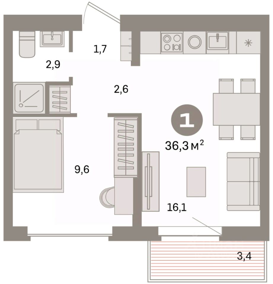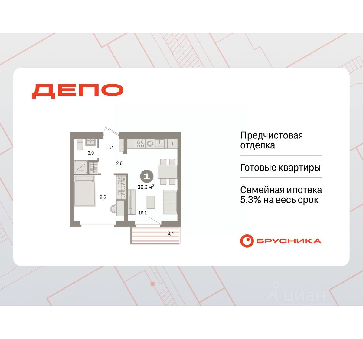 Квартира с кухней-гостиной и одной спальней в квартале "Депо". Особенности планировки: вид во двор, предчистовая отделка, балкон.