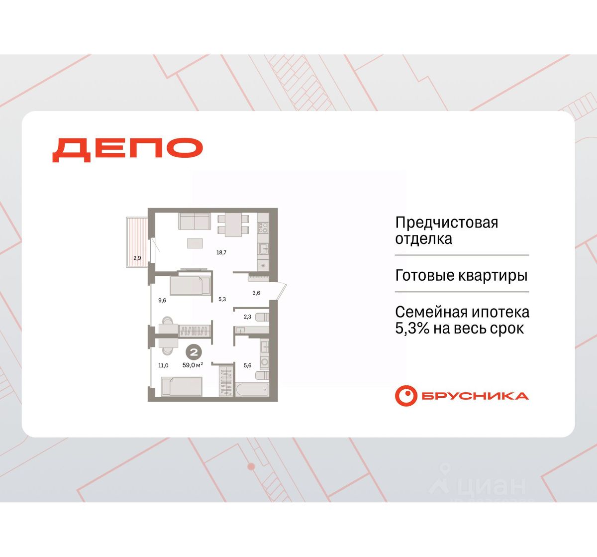 Квартира с кухней-гостиной и двумя спальнями в квартале "Депо". Особенности планировки: второй санузел, разнесённые спальни, предчистовая отделка, балкон.